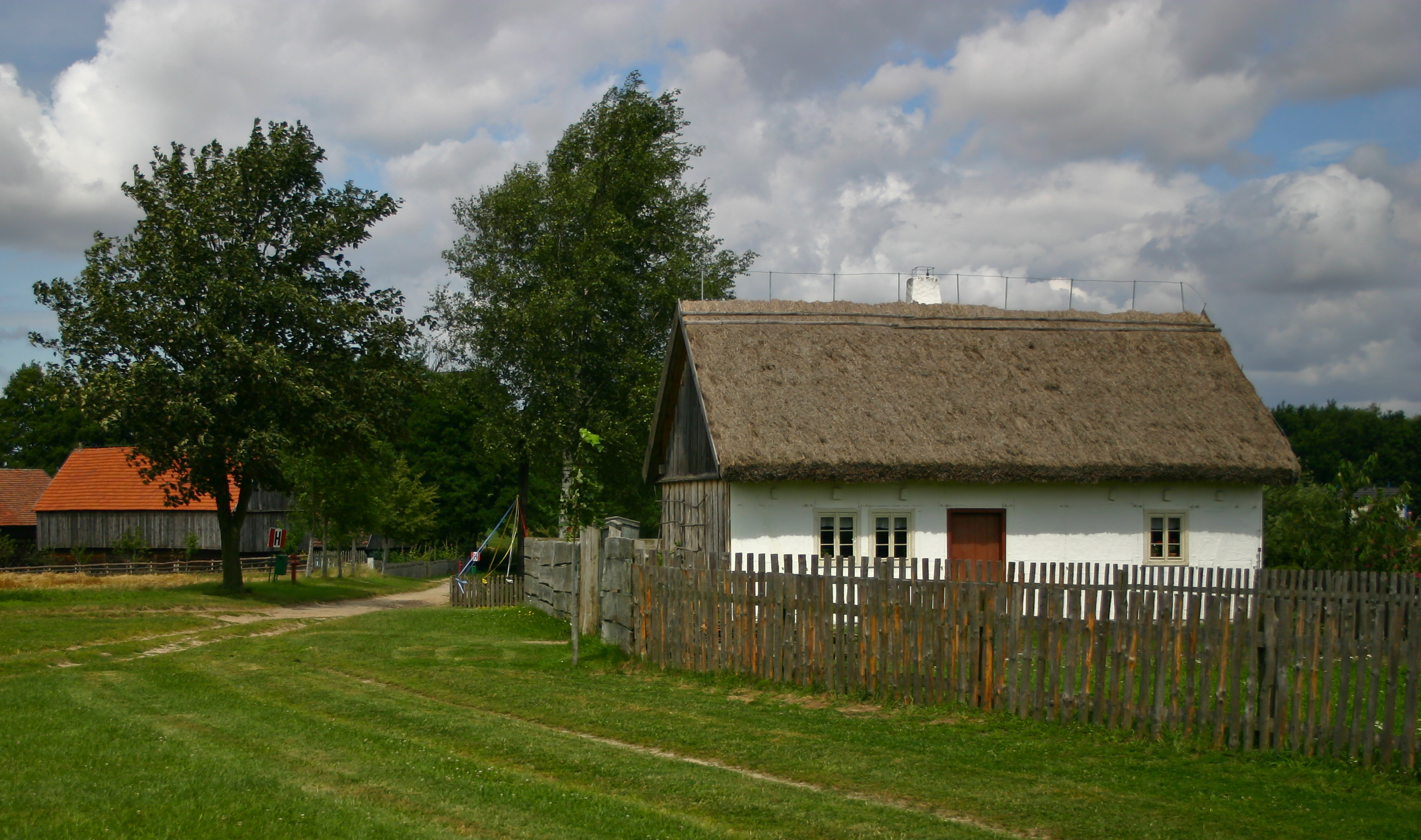 Chałupa ze wsi Zielona Wieś. Budynek o konstrukcji szkieletowej, szachulcowej z bielonymi ścianami. Dach dwuspadowy kryty słomianą strzechą.