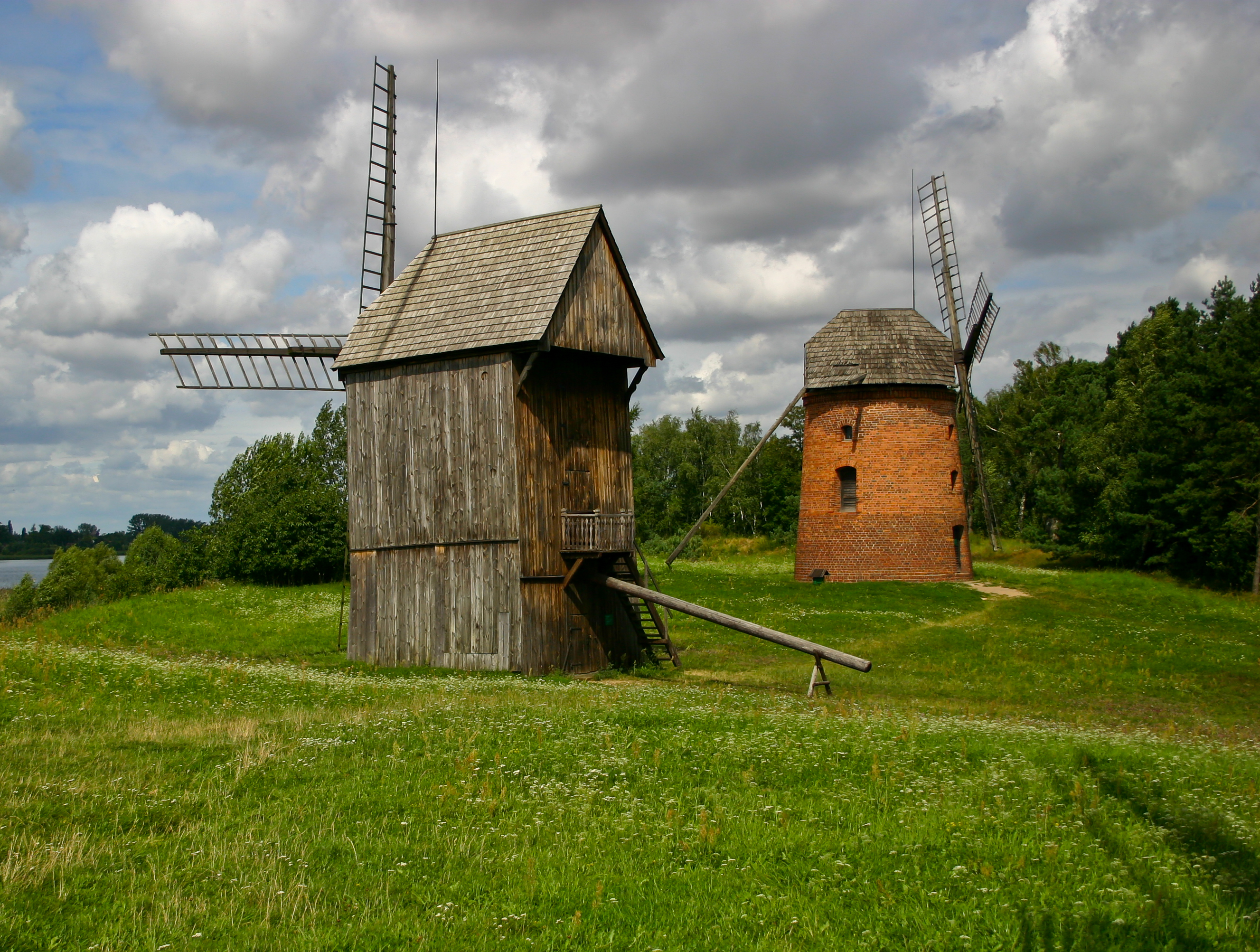 Wiatraki. Na pierwszym planie wiatrak typu koźlak z 1801 roku ze wsi Mierzewo (gmina Niechanowo). Wiatrak o konstrukcji słupowej szalowanej pionowo deskami. Budynek o trzech kondygnacjach. Dach dwuspadowy z naczółkiem od strony skrzydeł. Na drugim planie wiatrak typu holender z 1810 roku ze wsi Trzuskołoń. Wiatrak murowany z cegły. Budynek czterokondygnacyjny o formie ściętego stożka nakryty "czapą". |