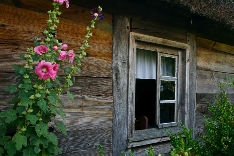 Okno chałupy ze wsi Sławno (koło Gniezna) z 1844 roku. Chałupa o konstrukcji sumikowo-łątkowej.