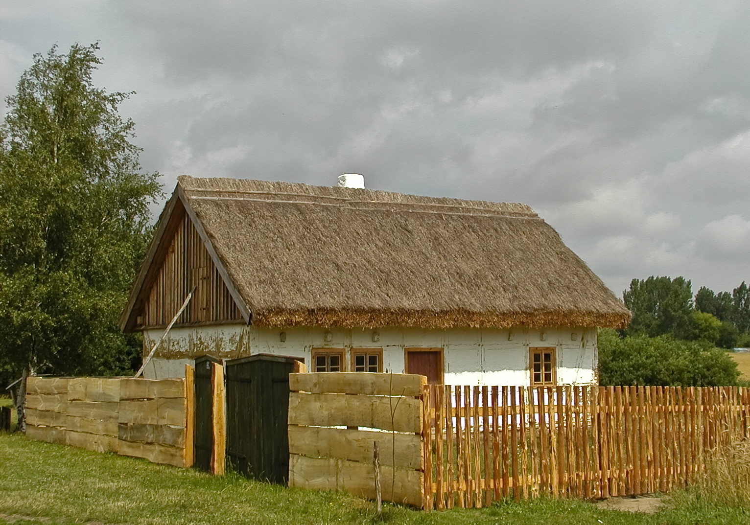 Chałupa ze wsi Zielona Wieś (koło Rawicza). Budynek o konstrukcji szkieletowej, szachulcowej z bielonymi ścianami. Dach dwuspadowy kryty słomianą strzechą.