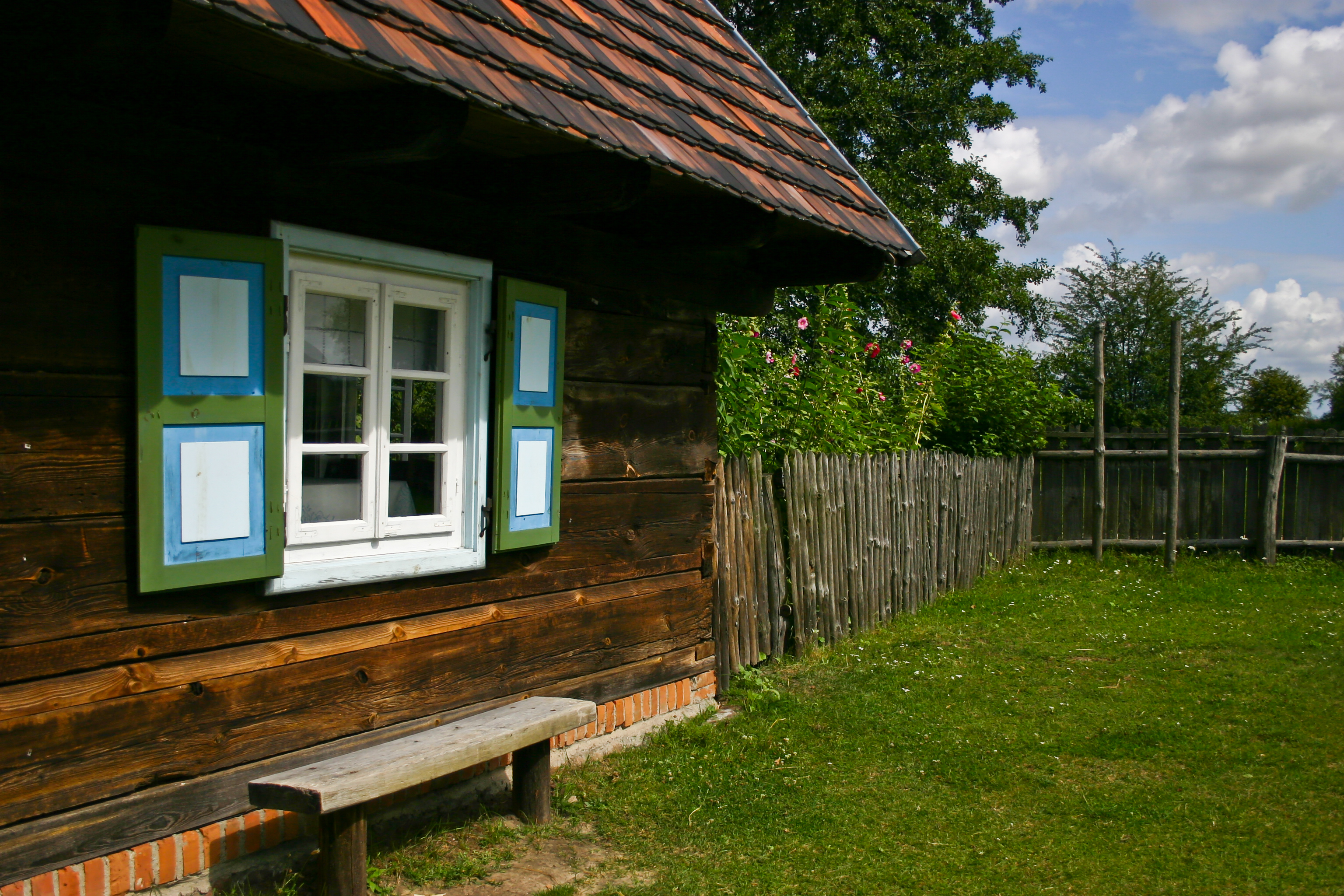 Okno z malowanymi okiennicami chałupy olęderskiej z Nowego Tomyśla z 1823 roku. Chałupa o konstrukcji zrębowej z ceglaną podmurówką. Dach dwuspadowy kryty gontem.