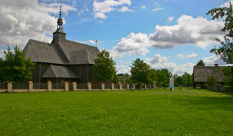 Widok ogólny na teren skanseny od strony wylotu wsi. Na zdjęciu widoczny po lewej XVIII-wieczny kościół ze wsi Wartkowice, dalej po prawej figura świętego Rocha na malowanym cokole i jeszcze dalej na prawo XVIII-wieczna karczma ze wsi Sokołowo Budzyńskie (koło Chodzieży).