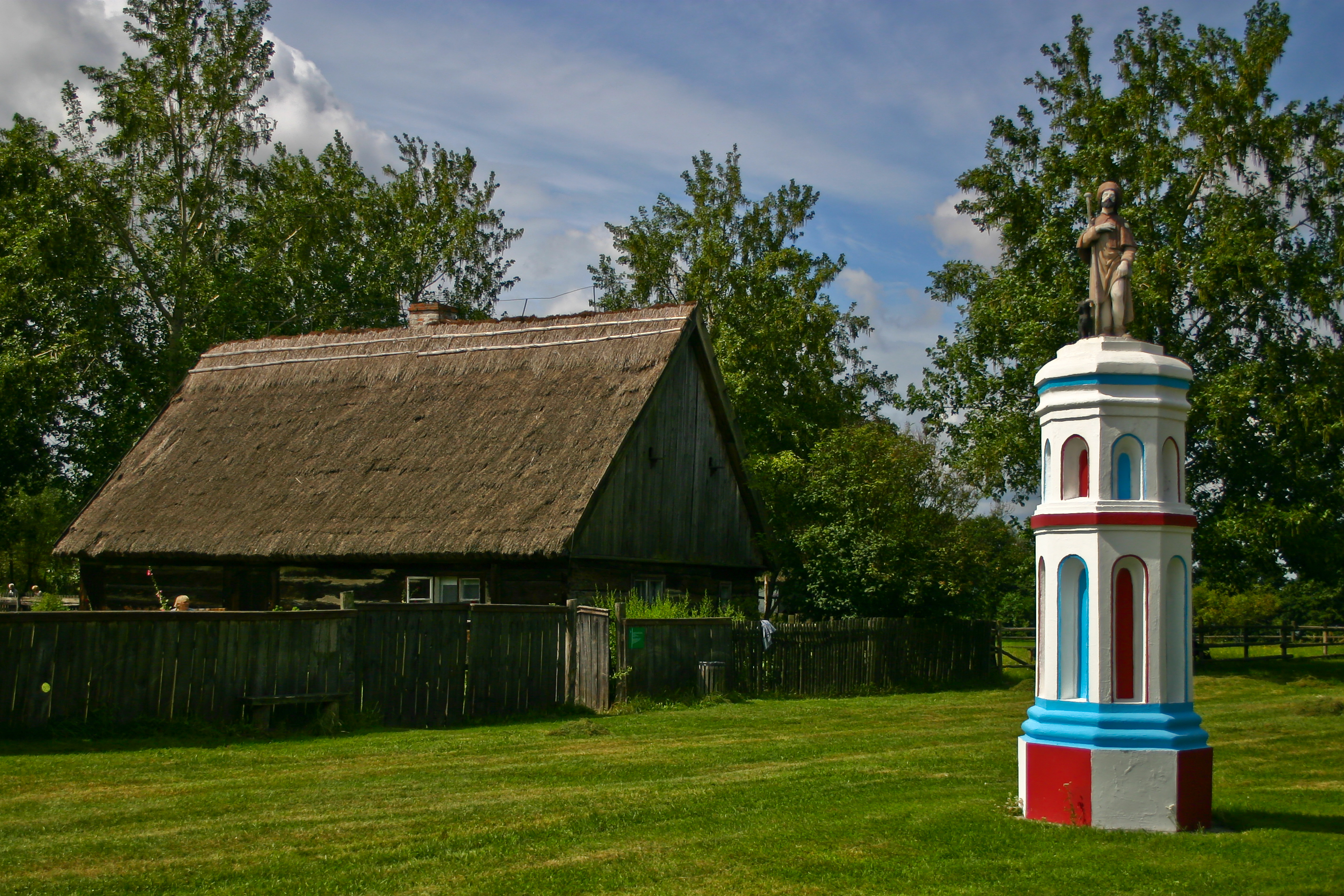 Figura świętego Rocha na malowanym cokole. Po lewej chałupa średnio zamożnego chłopa ze wsi Goździn (koło Grodziska Wielkopolskiego) z 1815 roku. Dach dwuspadowy kryty strzechą.