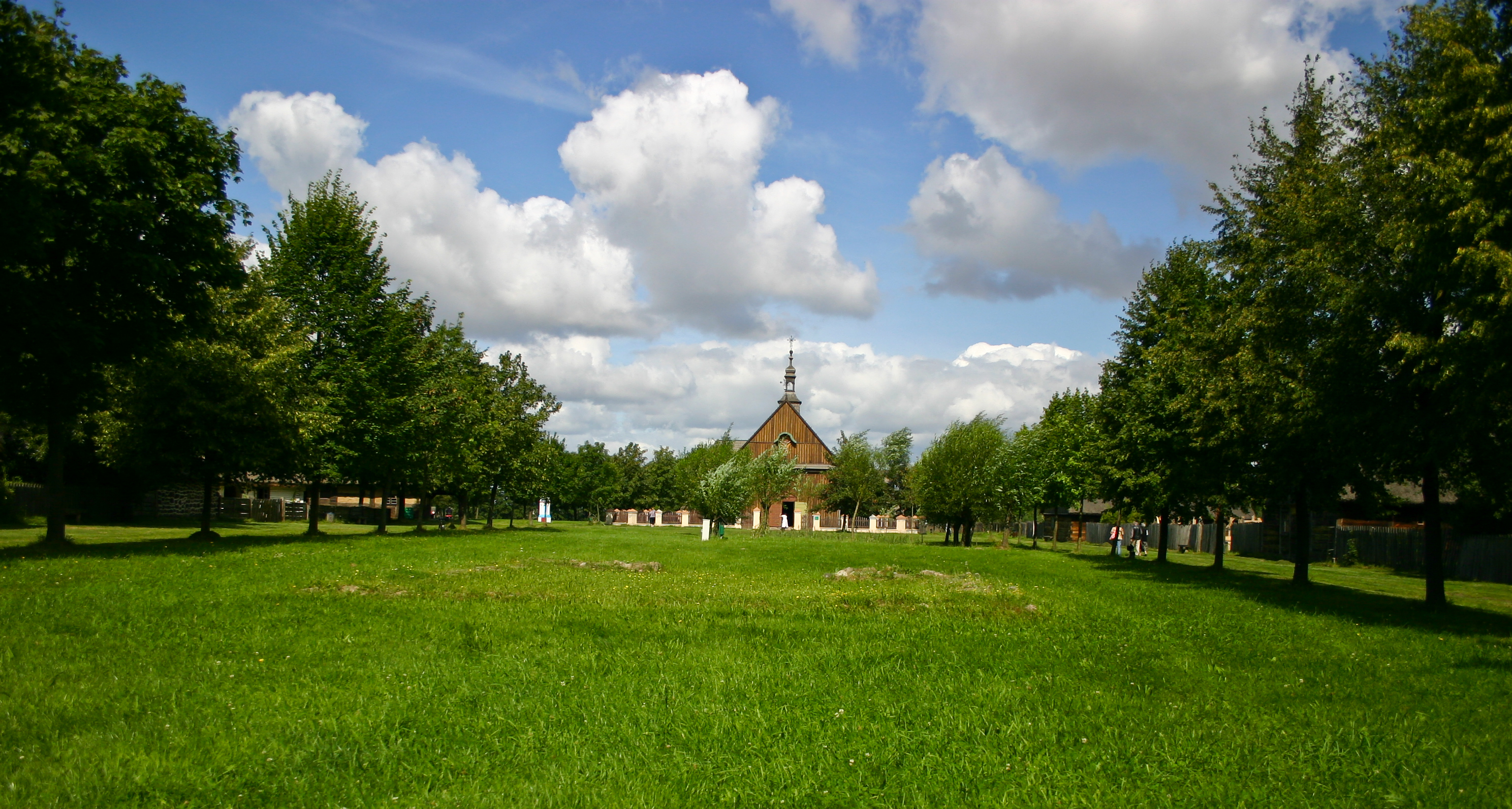 Widok na aleję drzew w skansenie. Na środku widoczny XVIII-wieczny kościół ze wsi Wartkowice.