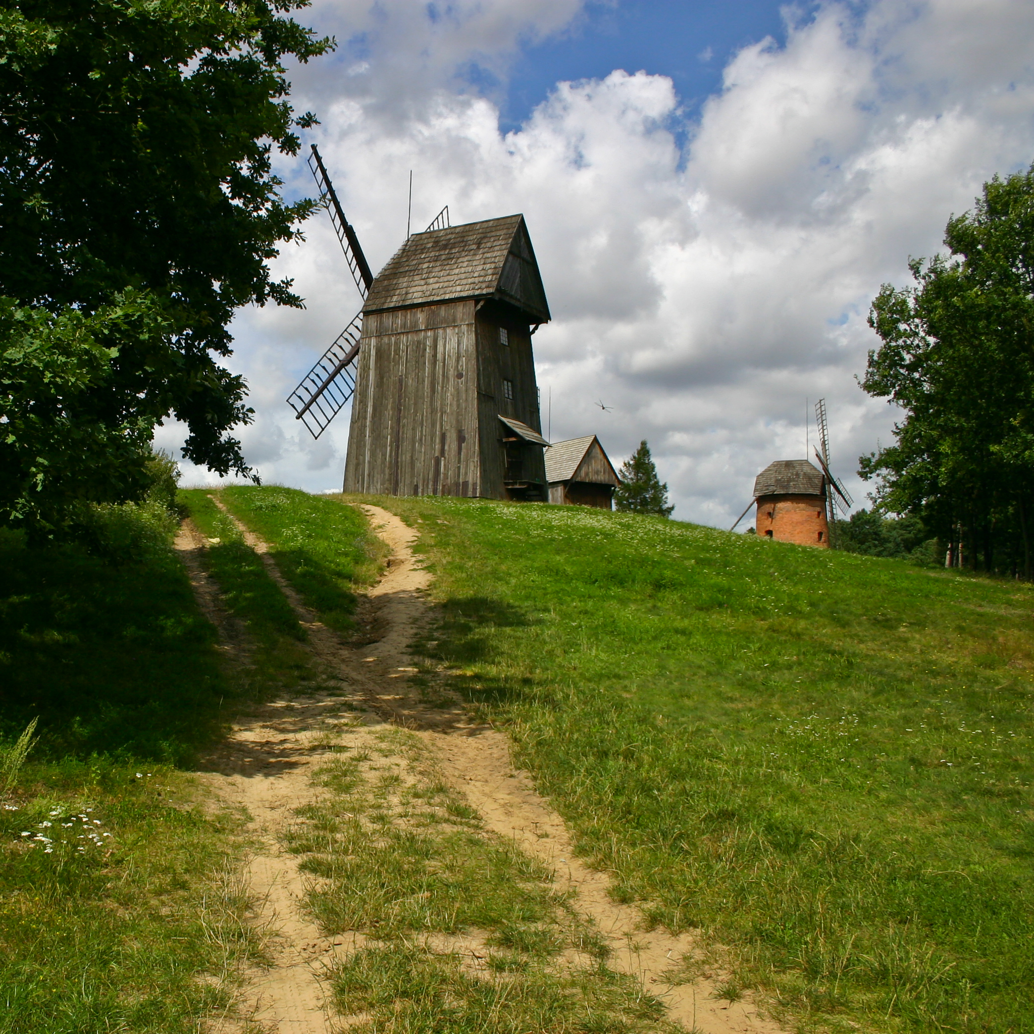 Wiatraki. Wiatrak typu paltrak z 1887 r. z miejscowości Kędzierzyn. Wiatrak o konstrukcji słupowej szalowanej pionowo deskami. Budynek o trzech kondygnacjach. Dach dwuspadowy z naczółkiem od strony skrzydeł, kryty gontem. Zza niego wystaje wiatrak typu koźlak z 1801 roku ze wsi Mierzewo (gmina Niechanowo). W dali wiatrak typu holender z 1810 roku ze wsi Trzuskołoń. Wiatrak murowany z cegły. Budynek o formie ściętego stożka. |