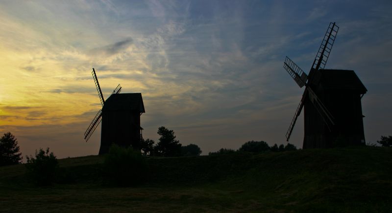 Wiatraki typu koźlak. Od prawej: wiatrak ze wsi Sołeczno koło Wrześni z z końca XIX wieku; wiatrak ze wsi Swadzim (koło Poznania) z XIX wieku. Wiatraki o konstrukcji słupowej szalowanej. Budynki o trzech kondygnacjach. Dachy dwuspadowe z naczółkiem od strony skrzydeł. Wiatraki eksponowane we wsi Lednogóra. |