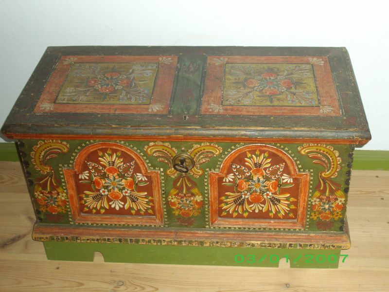 Zdobiona skrzynia wianna z 1895 rok wewnątrz chałupy olęderskiej. Skrzynia drewniana, malowana.