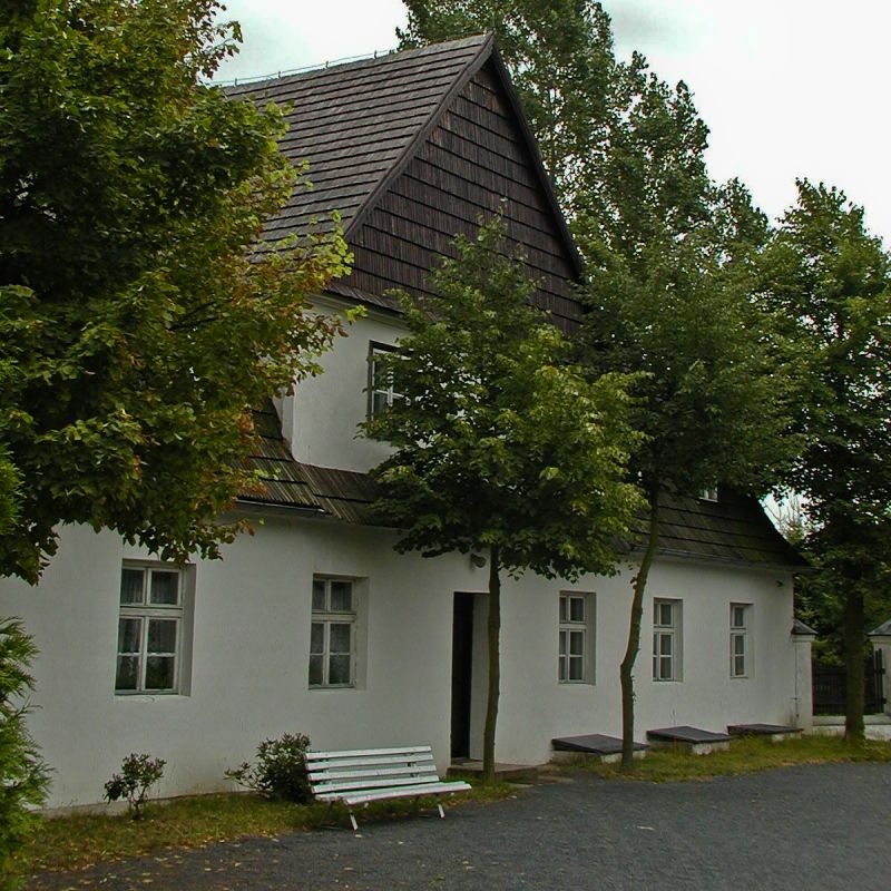 Oficyna z Łomnicy (koło Zbąszynia) z ok. 1770 roku. Budynki murowane z dachami uskokowymi krytymi gontem.