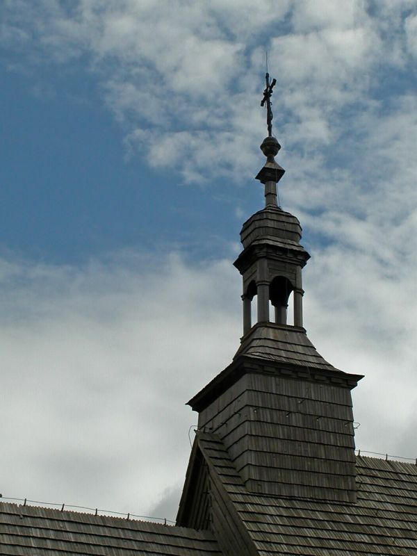 Wieża XVIII-wiecznego kościoła ze wsi Wartkowice. Wieża i dach kryte gontem.