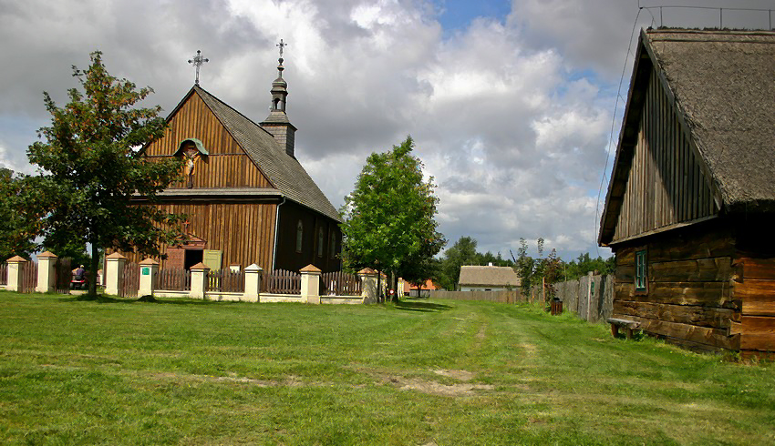 Widok na teren skansenu. Po prawej fragment chałupy amożnego gospodarza ze wsi Pakosław z 1834 roku. Po lewej kościół ze wsi Wartkowice (koło Uniejewa) z XVIII wieku.
