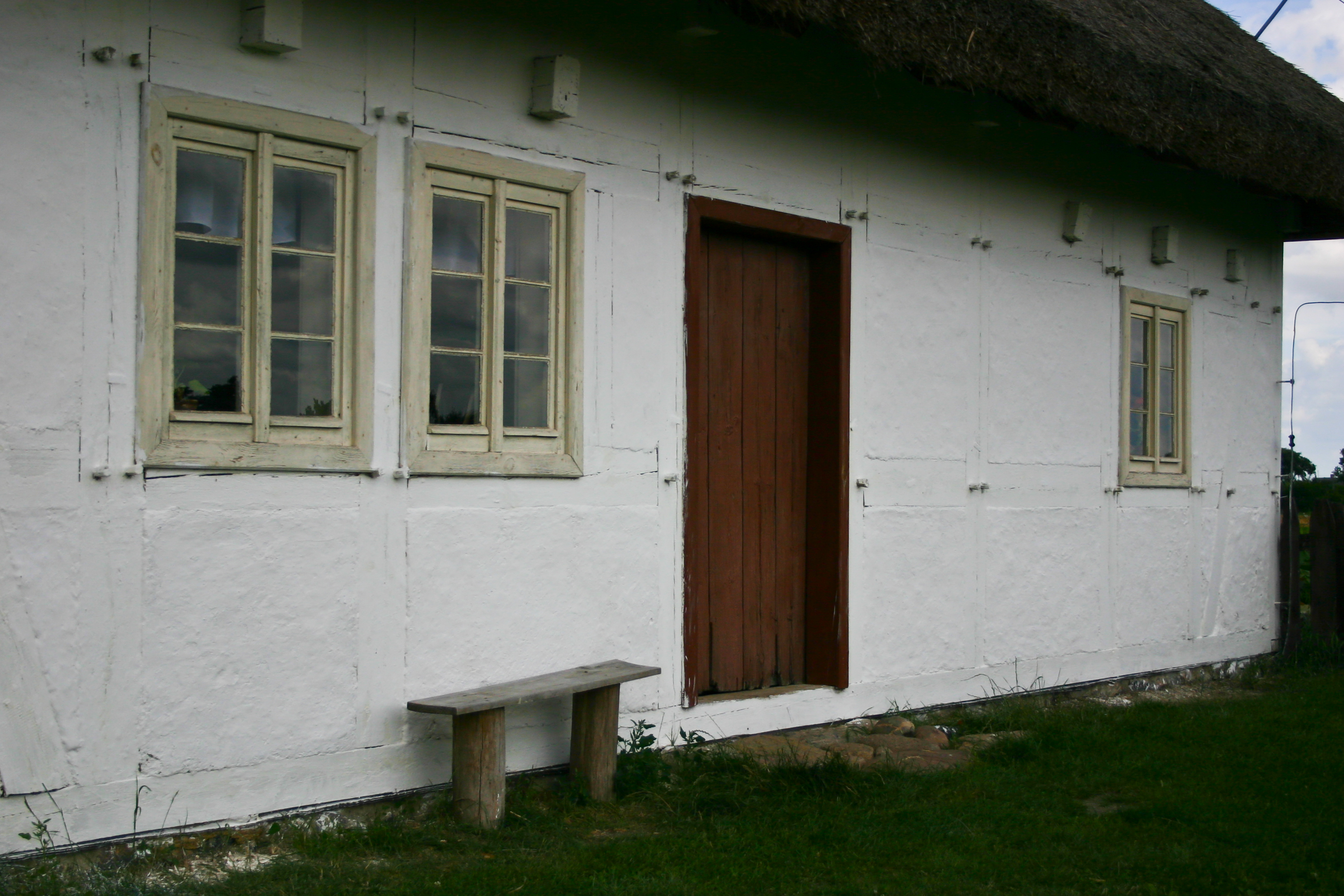 Chałupa ze wsi Zielona Wieś. Budynek szerokofrontowy o konstrukcji szachulcowej z bielonymi ścianami.