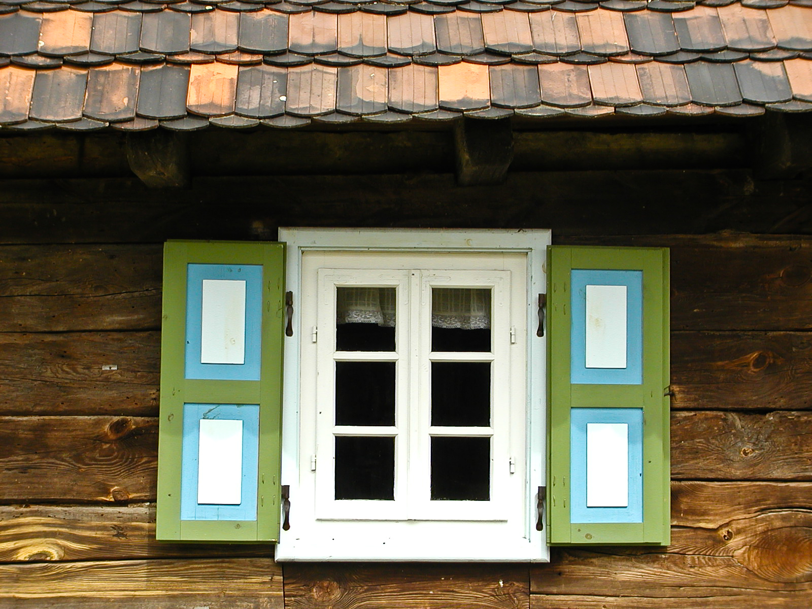 Okno z malowanymi okiennicami chałupy olęderskiej z Nowego Tomyśla z 1823 roku.