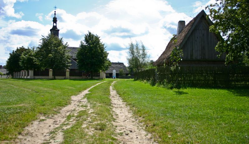 Widok ogólny na skansen z drogi biegnącej w kierunku wiatraków.