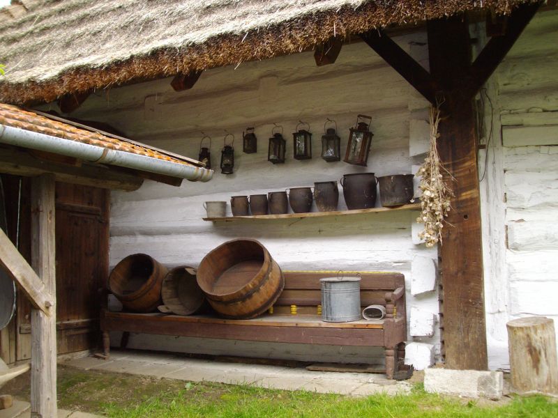Przysłupowa konstrukcja chałupy ze wsi Markowa. Konstrukcję przysłupową wypełniają ściany o konstrukcji zrębowej. Widać też dach ze słomy kładzionej schodkowo.