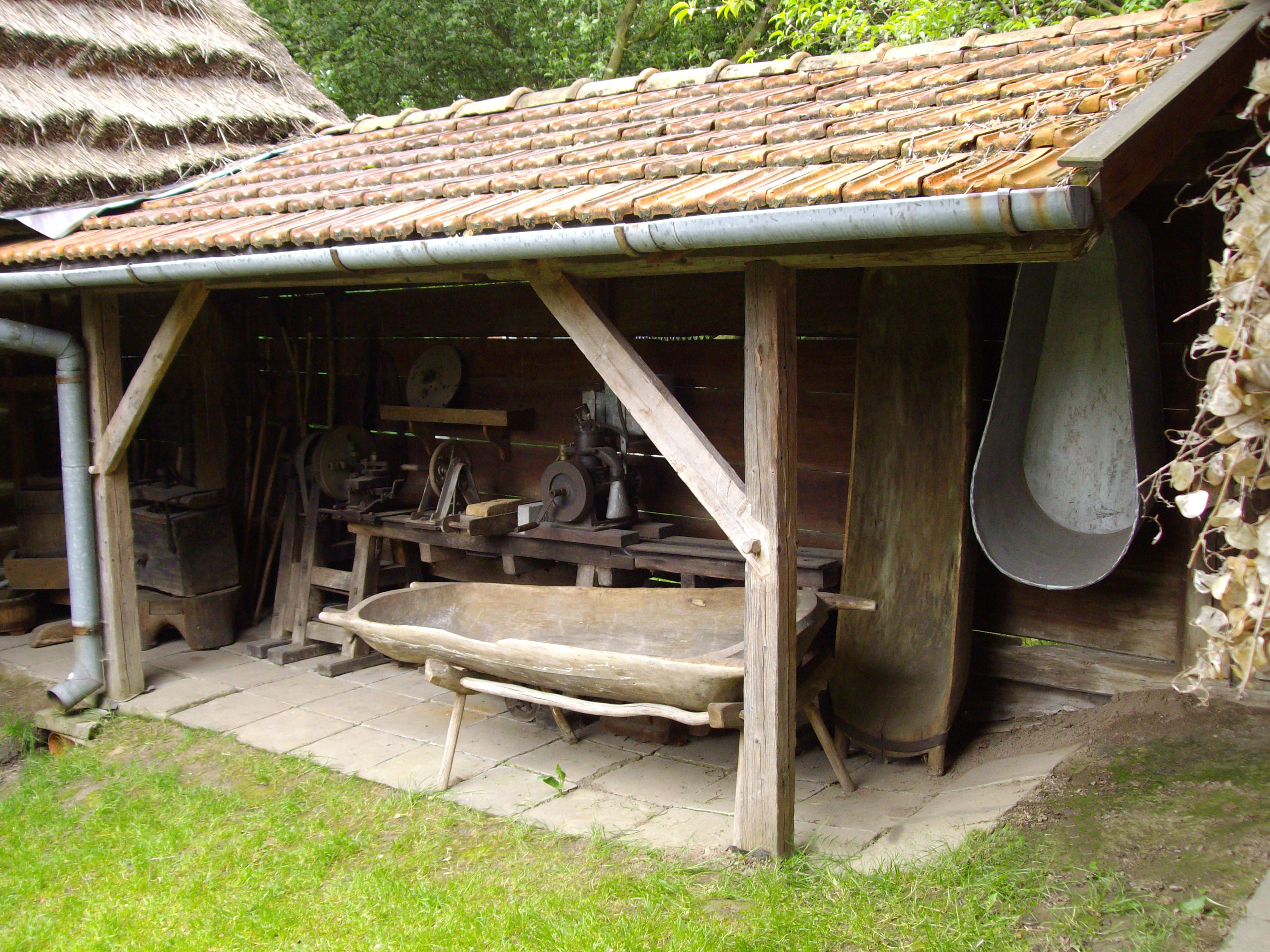 Warsztat przydomowy. Sprzęt do prac gospodarczych. Na zdjęciu widoczne drążone w pniach koryta i metalowa balia. Z tyłu po lewej koło szlifierskie.