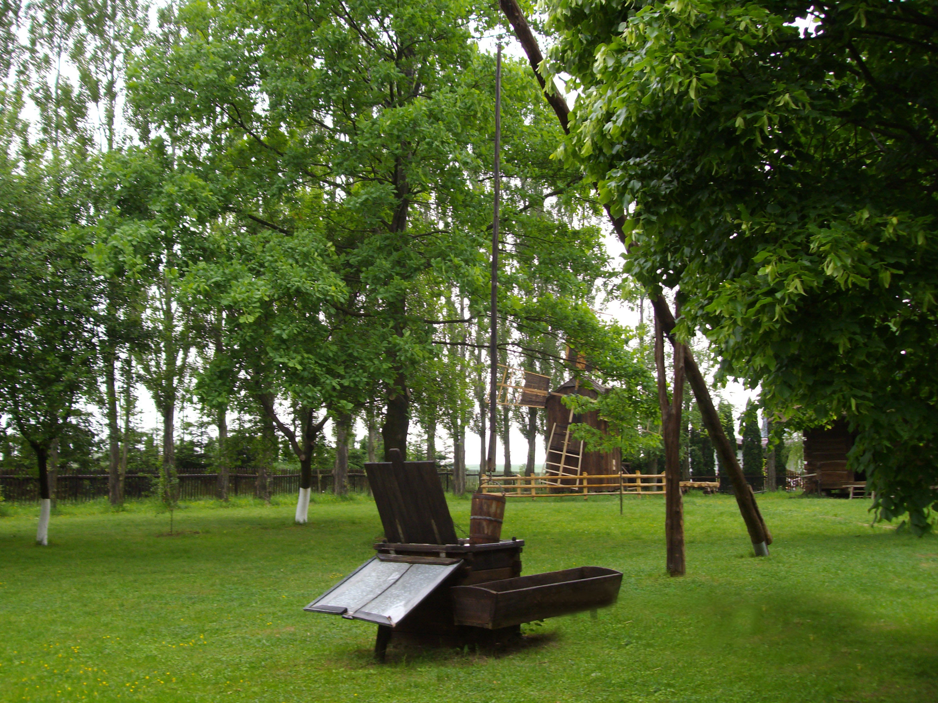 Studnia o cembrowinie zrębowej z metalową i drewnianą klapą. Na studni drewniane wiadro do czerpania wody, a obok niej drewniane koryto.