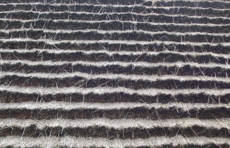 Dach poszywany metodą schodkową kiczami. Strzecha słomiana.