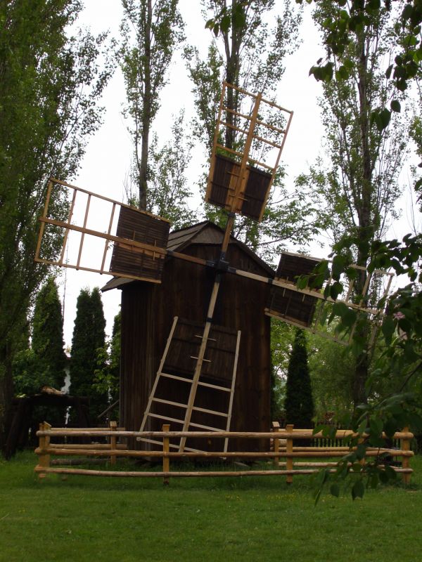 Usytuowany w zagrodzie wiatrak to "koźlak", zbudowany w konstrukcji słupowo - szkieletowej. Obiekt jednopoziomowy, stoi na dębowym "królu", na którym może być dowolnie obracany w zależności od kierunku wiatru. Osadzone be dębowym wale skrzydła wiatraka opatrzone zostały łupanymi z drewna "piórami", zdejmowanymi lub dokładanymi w zależności od siły wiatru. Dach z niewielkim naczółkiem kryty gontem. |