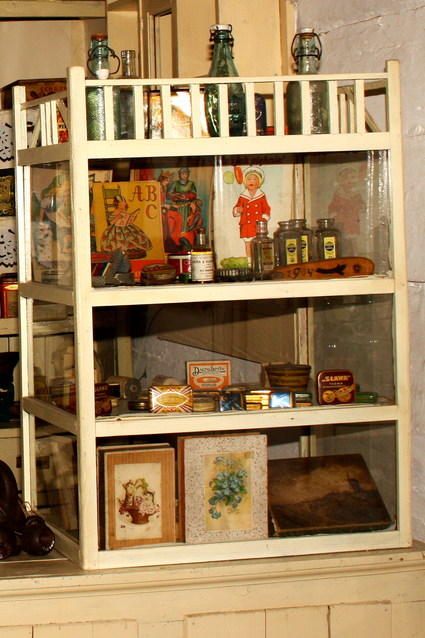 Wyposażenie sklepu z okresu międzywojennego. W oszklonej szafce umieszczono autentyczne paczki ołówków, piór, kredek, wyroby tytoniowe: papierosy, tytoń, gilzy, cygara, wyroby pasmanteryjne, artykuły szkolne, czy przedmioty użytku domowego.
