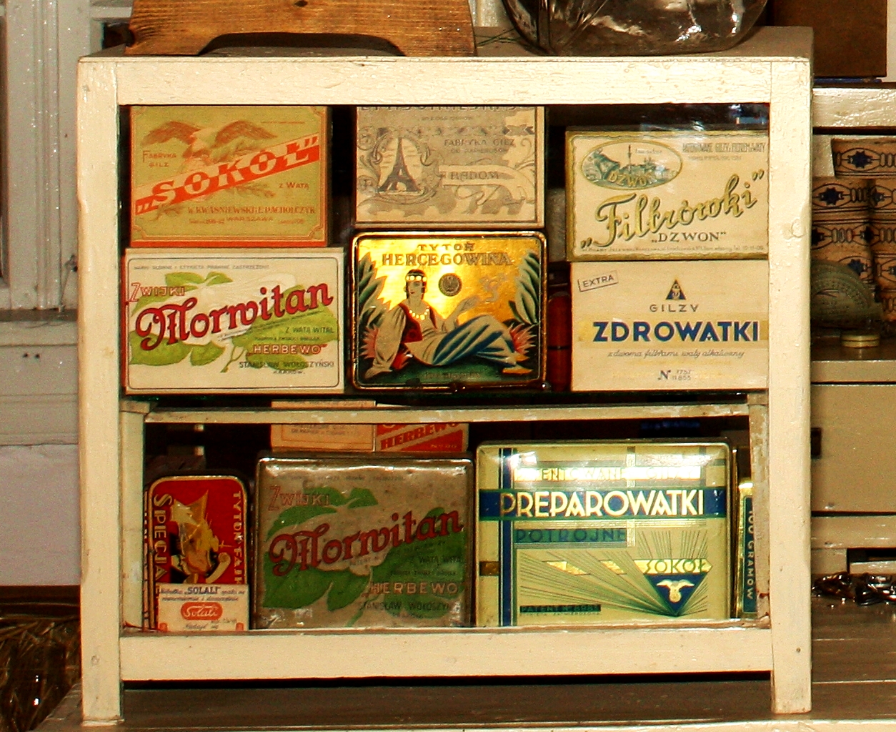 Wyposażenie sklepu z okresu międzywojennego. W oszklonej szafce umieszczono wyroby tytoniowe: papierosy, tytoń, gilzy, cygara, wyroby spożywcze i przedmioty użytku domowego.