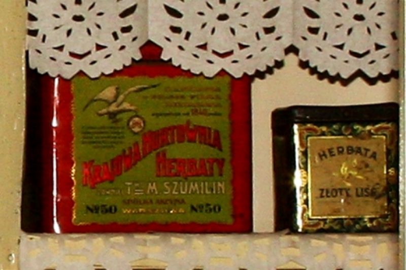 Wyposażenie sklepu z okresu międzywojennego: puszki z herbatą.
