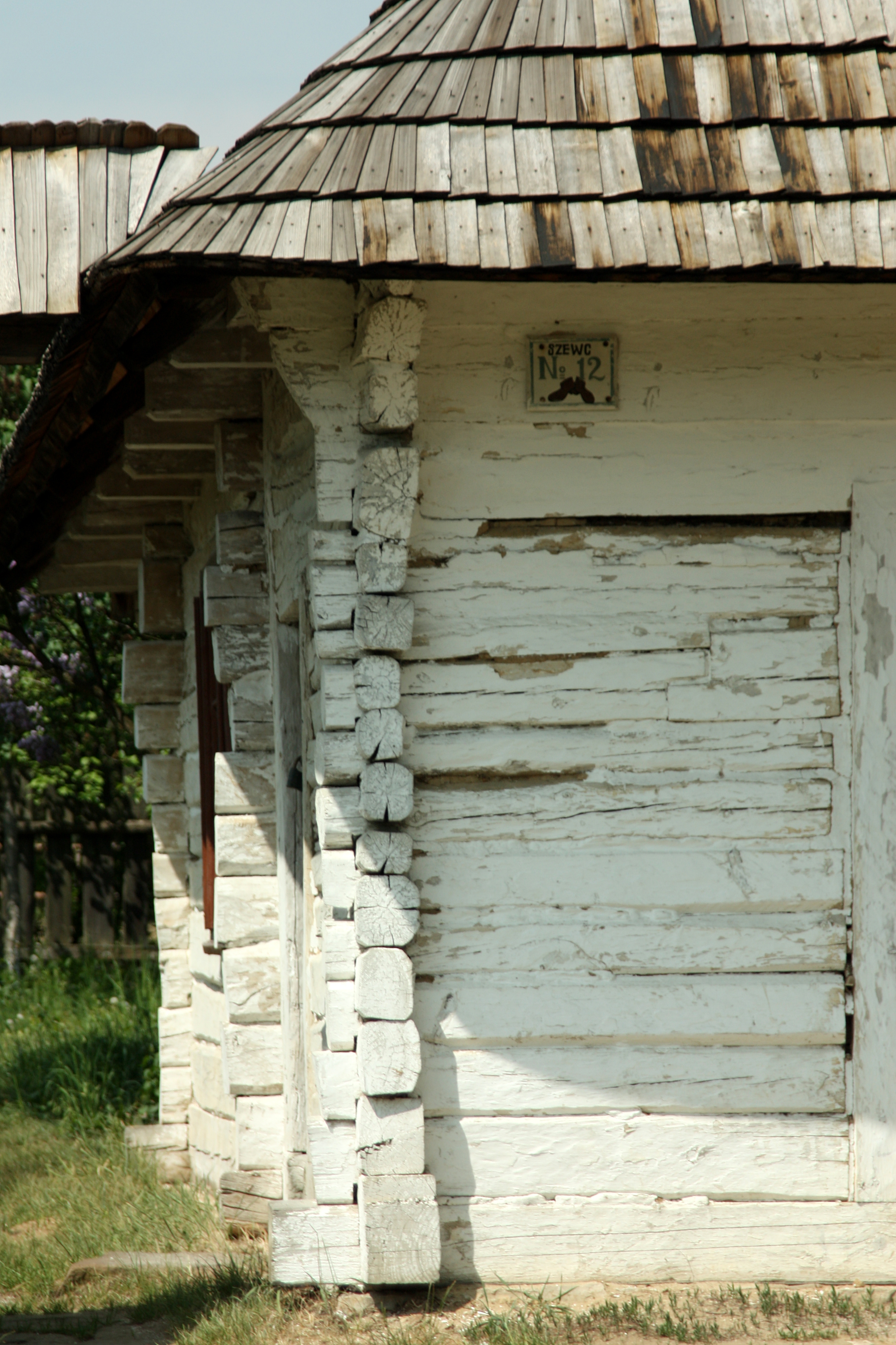 Fragment chałupy ze wsi Daleszyce. Węgły łączone na obłap z nierówno ściętymi ostatkami.