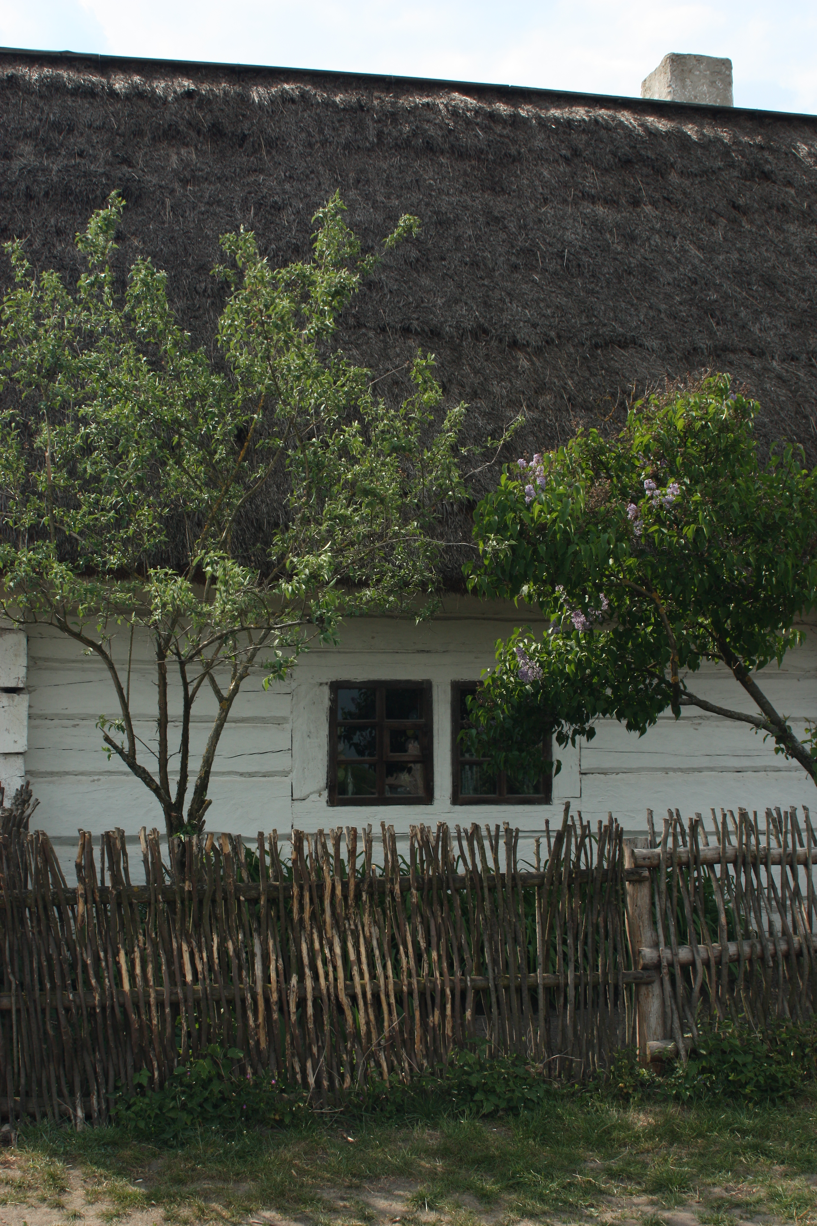 Chałupa o konstrukcji zrębowej z bielonymi ścianami. Dach kryty słomianą strzechą. Przed chałupą ogród otoczony płotem plecionym z chrustu.