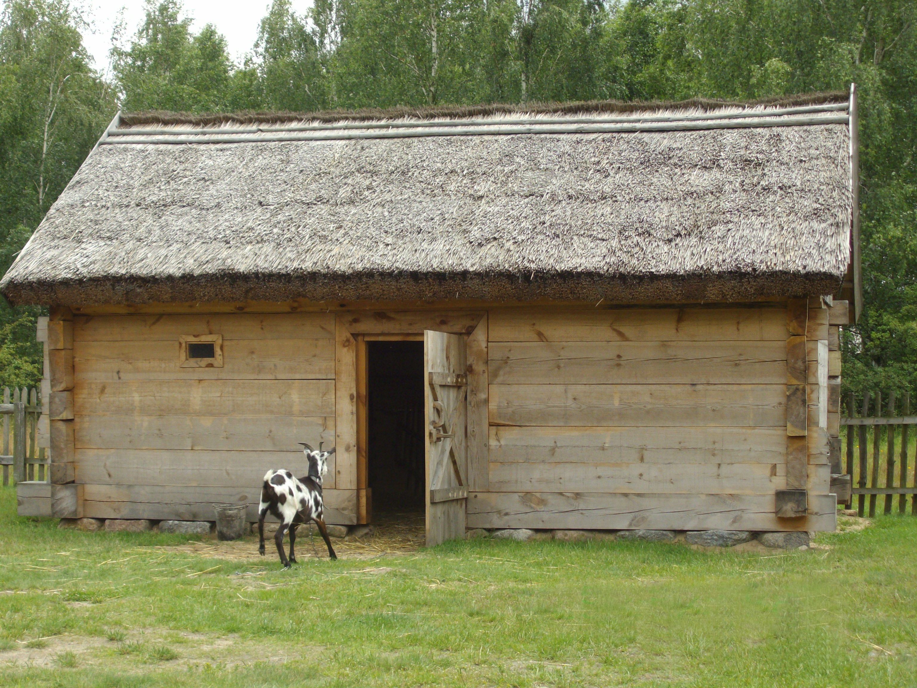 Budynek inwentarski. Budynek o konstrukcji zrębowej. Dach dwuspadowy kryty słomianą strzechą. Fundament z kamieni polnych.