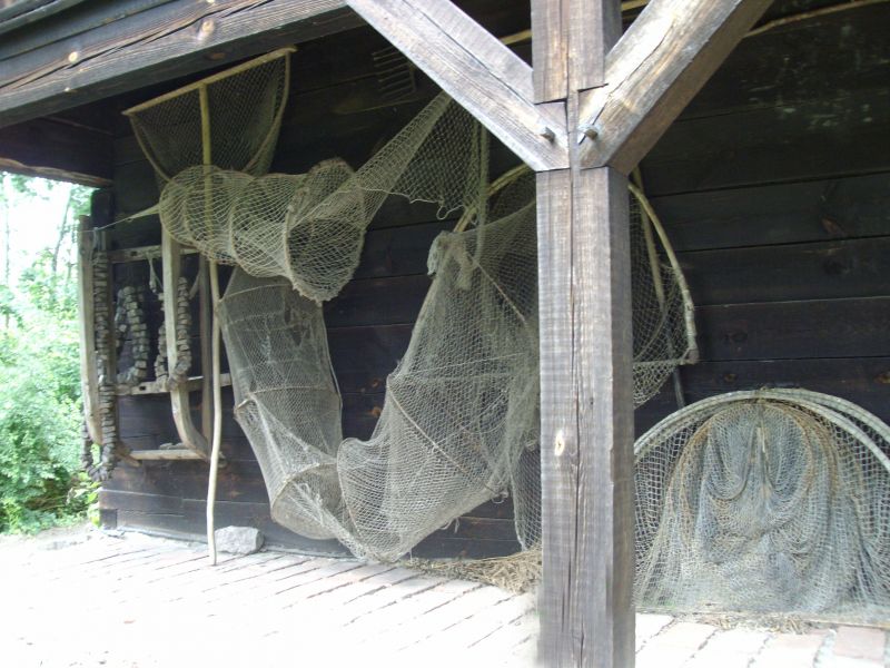 Więcierze i inne sieci pułapkowe suszące się pod podcieniem jednej z chałup.