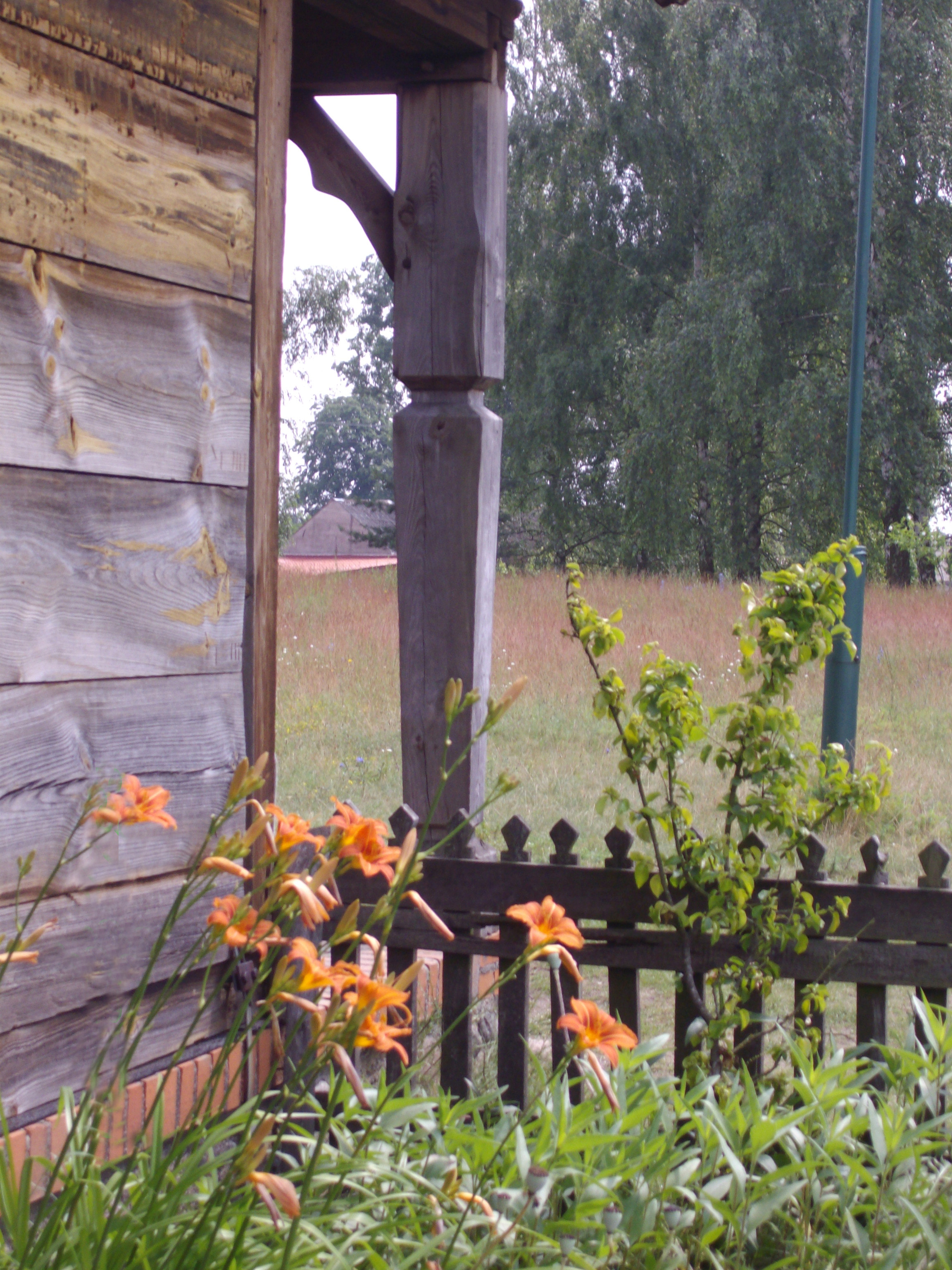 Fragment ściany sumikowo-łątkowej z słupem podcienia chałupy ze wsi Kałądek z I połowy XIX wieku. Przy chałupie ogród kwiatowy.