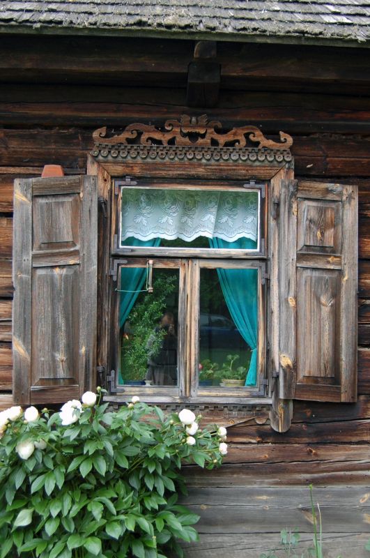 Okno chałupy ze wsi Łyse z 1923 roku. Okno z ozdobnymi nadokiennikami (koruna) i podokiennikami i okiennicami.