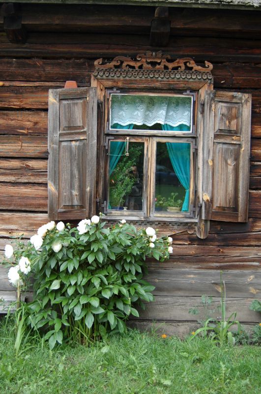 Okno chałupy z Łysych pochodząca z 1923 roku. Jej ściany zostały zbudowane z bali sosnowych łączonych na węgłach na „jaskółczy ogon”. Chałupa posiada dach dwuspadowy o konstrukcji krokwiowo-jętkowej, pokryty gontami.