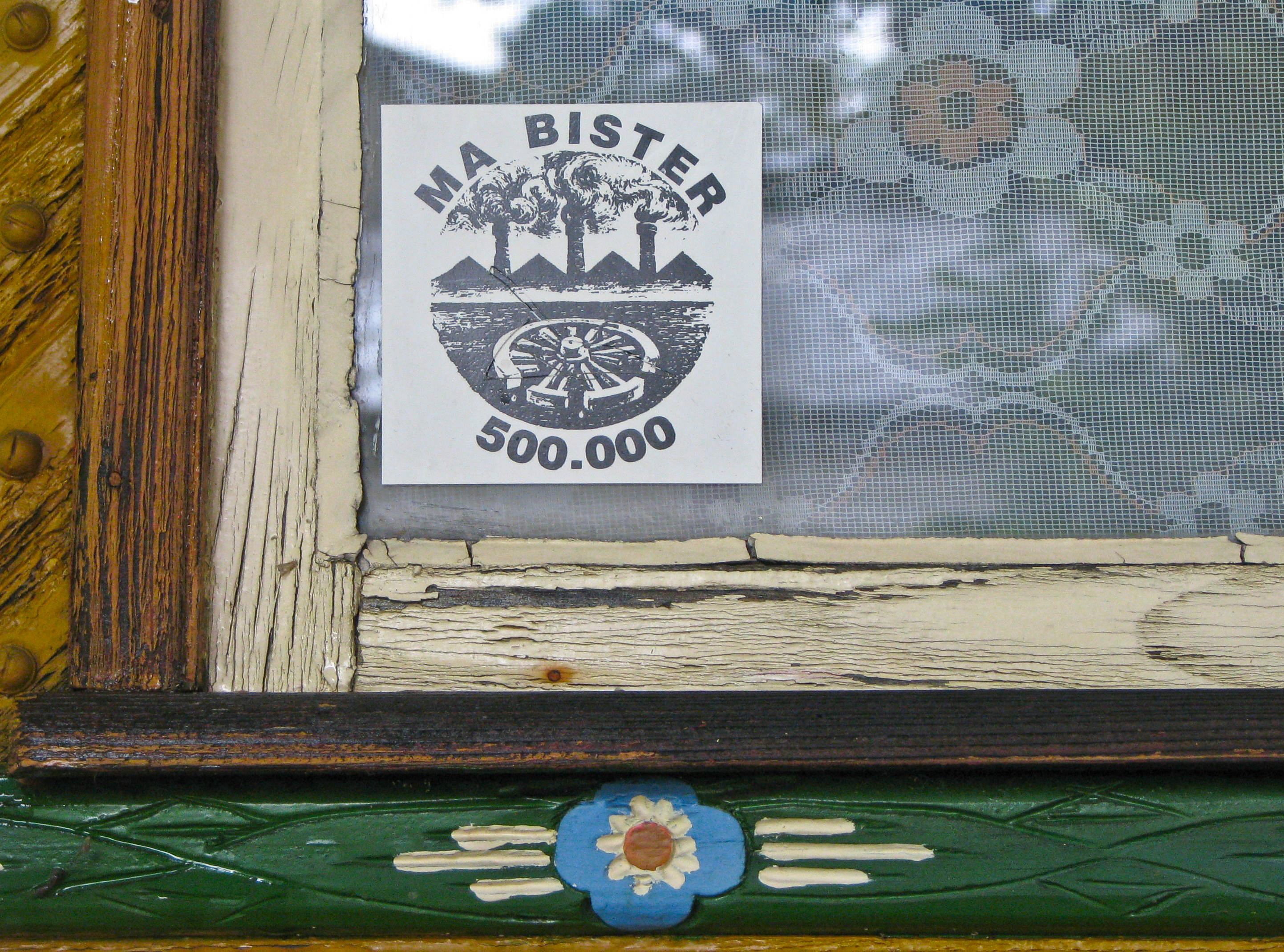 Fragment wozu cygańskiego. Na szybie papierowa nalepka z napisem "Ma Bister 500000" upamiętniająca zagładę Romów podczas II wojny światowej.