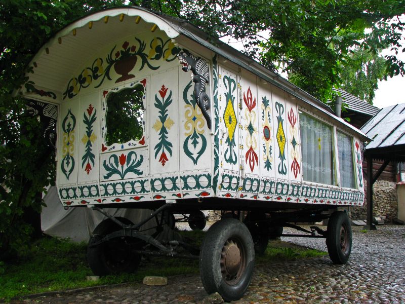 Wóz cygański - element ekspozycji plenerowej na terenie Muzeum Etnograficznego w Tarnowie. Wozy były nie tylko środkiem transportu Romów, ale i mieszkaniem. Dlatego prócz obudowy mają również zadaszenie. Drewniana obudowa wozu bogato zdobiona kolorową, kwiatową ornamentyką, lusterkami i rzeźbionymi figurami smoków. Wóz z metalowym dyszlem i kołami samochodowymi. |