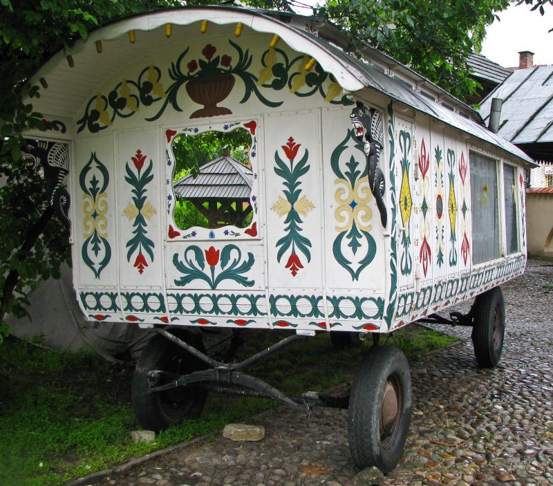Wóz cygański - element ekspozycji plenerowej na terenie Muzeum Etnograficznego w Tarnowie. Wozy były nie tylko środkiem transportu Romów, ale i mieszkaniem. Dlatego prócz obudowy mają również zadaszenie. Drewniana obudowa wozu bogato zdobiona kolorową, kwiatową ornamentyką, lusterkami i rzeźbionymi figurami smoków. Wóz z metalowym dyszlem i kołami samochodowymi. Dach kryty blachą. |