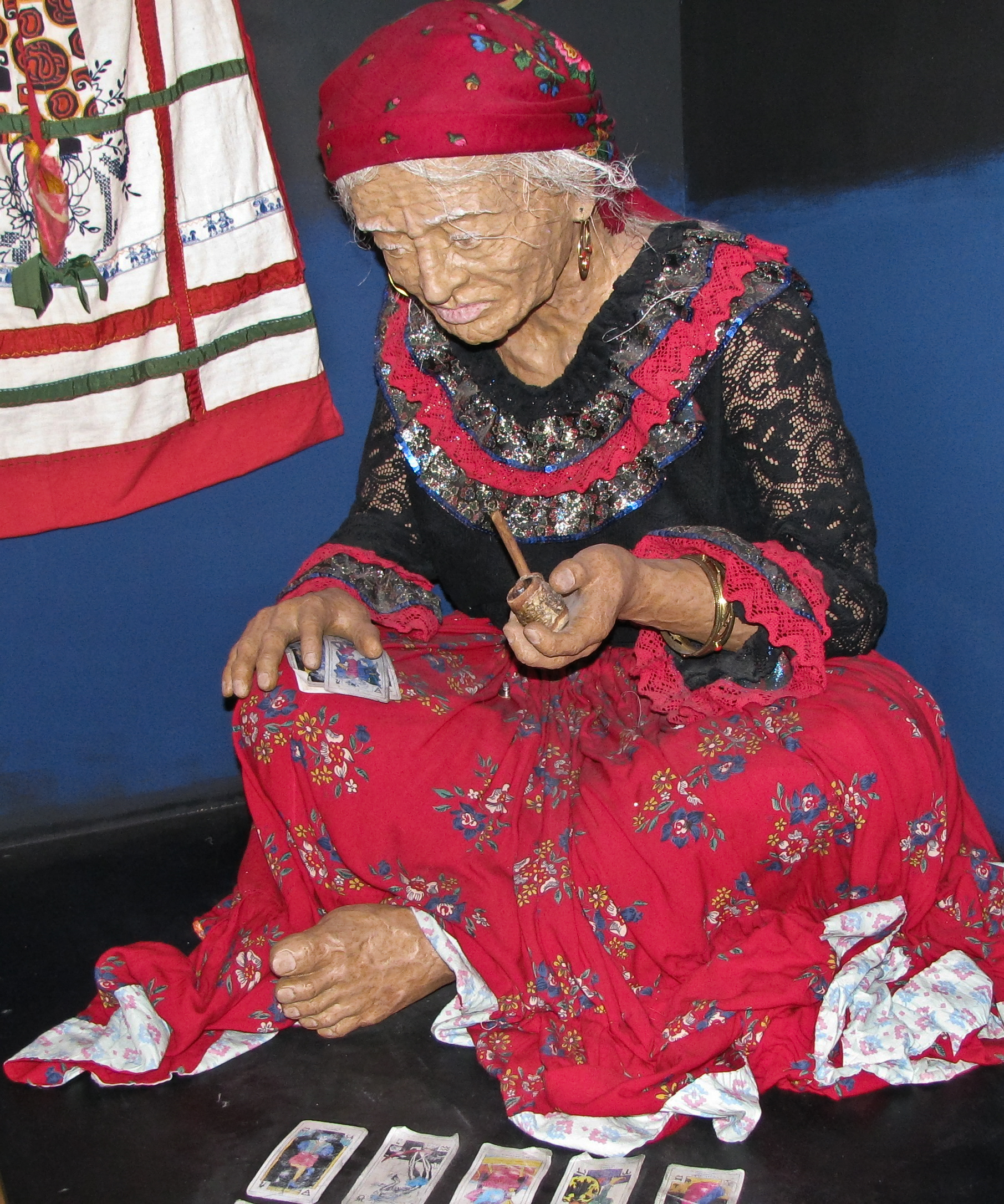Fragment wystawy poświęconej historii i kulturze Romów/Cyganów w Muzeum Etnograficznym w Tarnowie. Na zdjęciu kobieta wróżąca z kart.