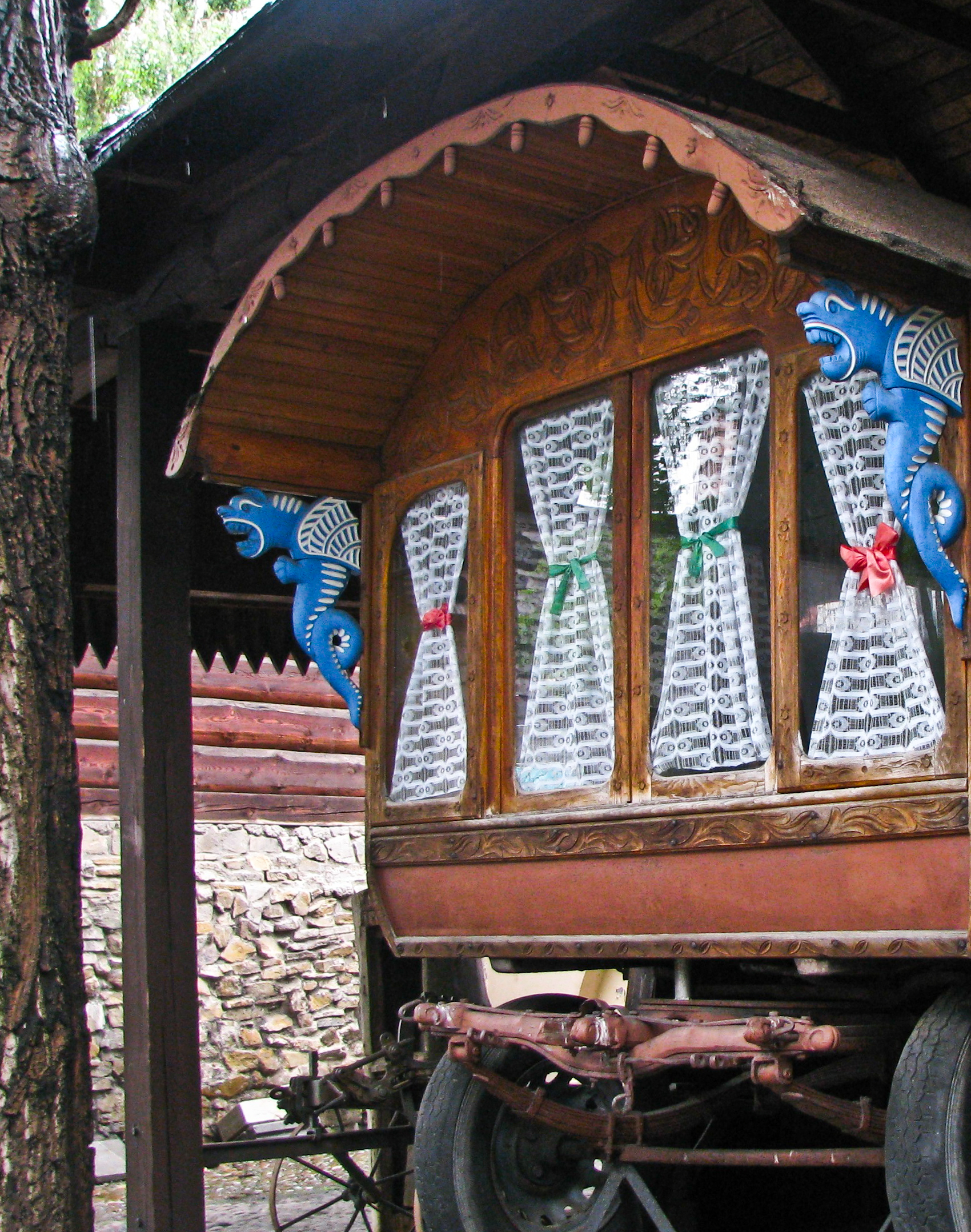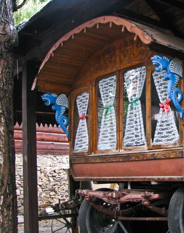 Przednia ściana wozu cygańskiego. Drewniana obudowa wozu zdobiona ornamentyką roślinną i polichromowanymi, rzeźbionymi figurami smoków. Wóz z metalowym dyszlem i kołami samochodowymi. Dach kryty blachą.