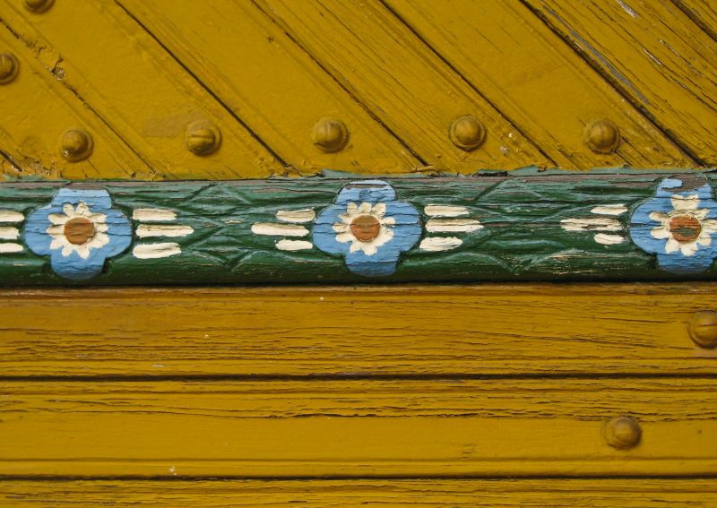 Detal wozu cygańskiego - drewniana listwa z ornamentem kwiatowym i nabijane nitami deski szalunku.
