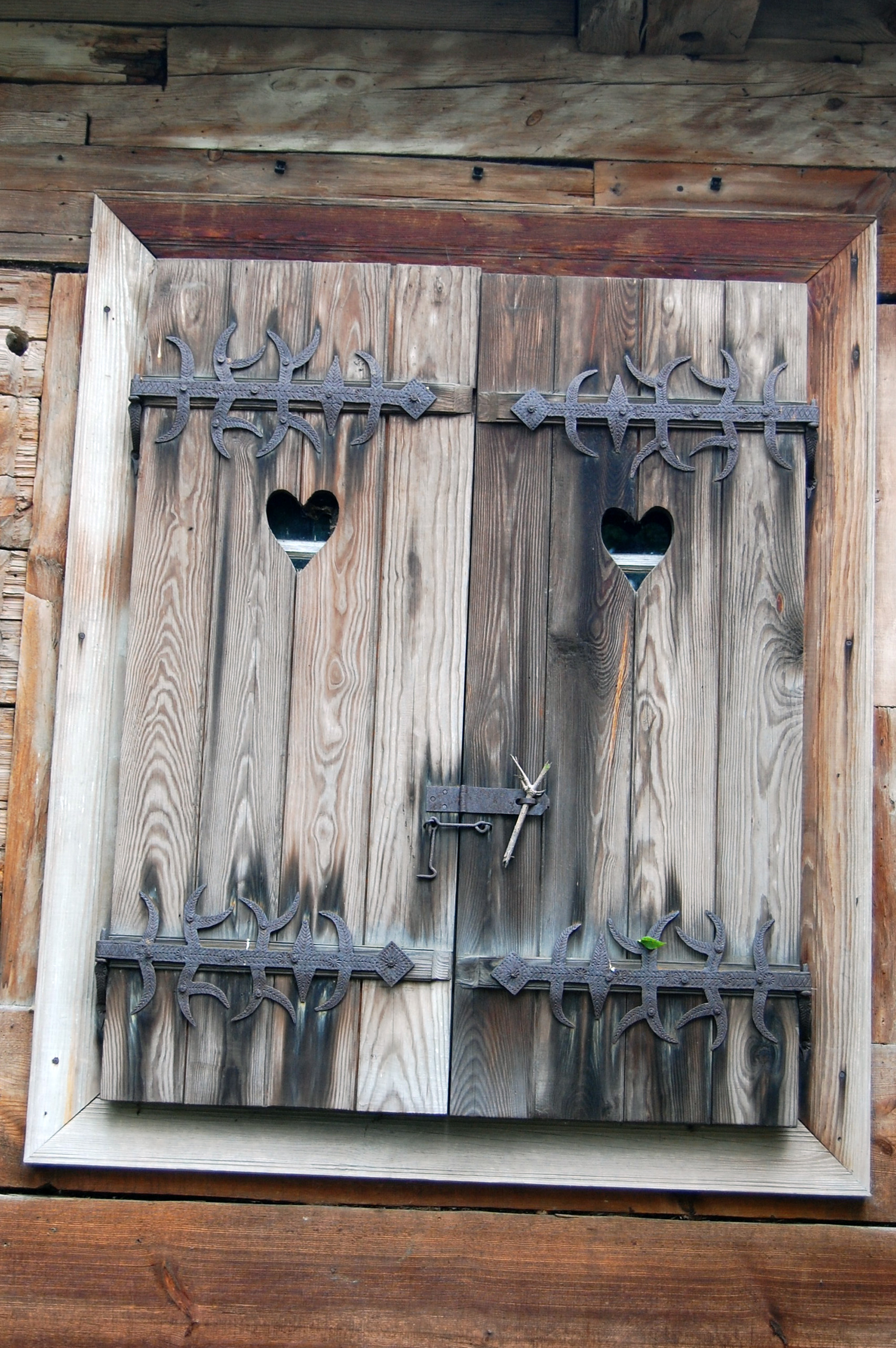Okiennice we dworze ze wsi Brzózki z XIX wieku. Okiennice z wycięciami w kształcie serduszek i zdobionymi zawiasami kowalskiej roboty.