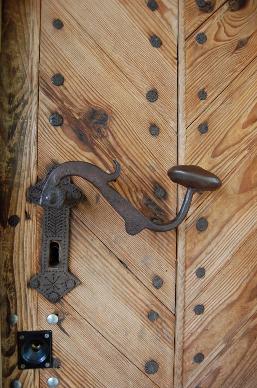 Zdobiona klamka drzwi we dworze ze wsi Brzózki z XIX wieku. Klamka i zamek są wyrobem kowalskim.