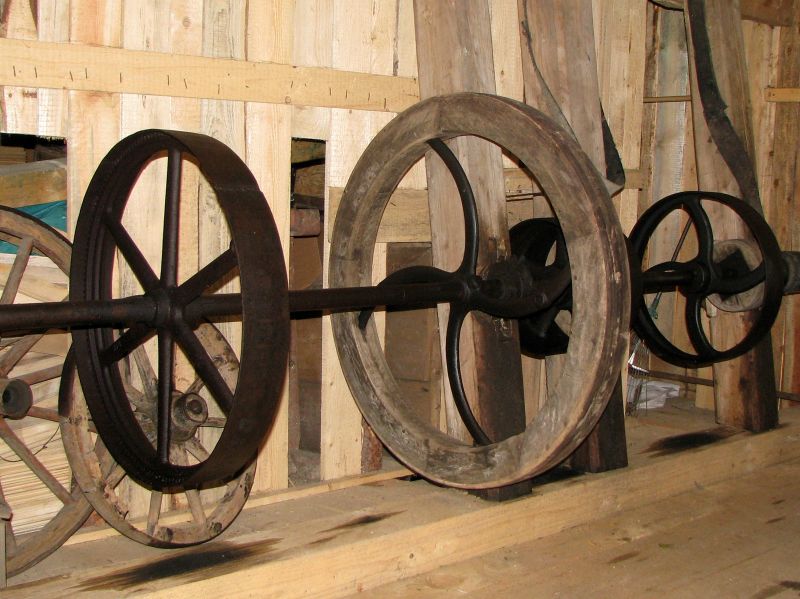 Wnętrze młyna wodnego. Na zdjęciu element napędowy.