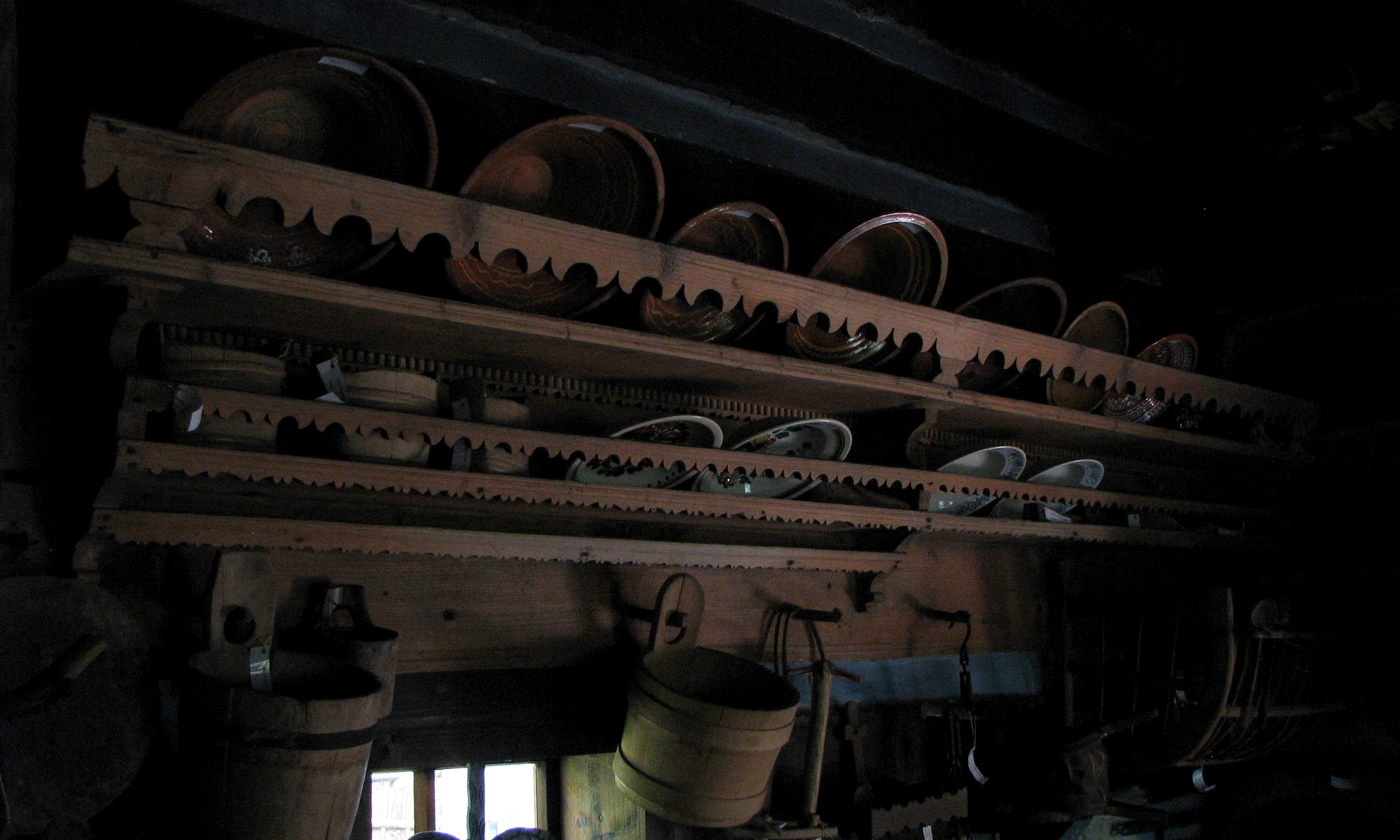 Wnętrze kuchni w chałupie Banasików. Półka do przechowywania talerzy i mis.