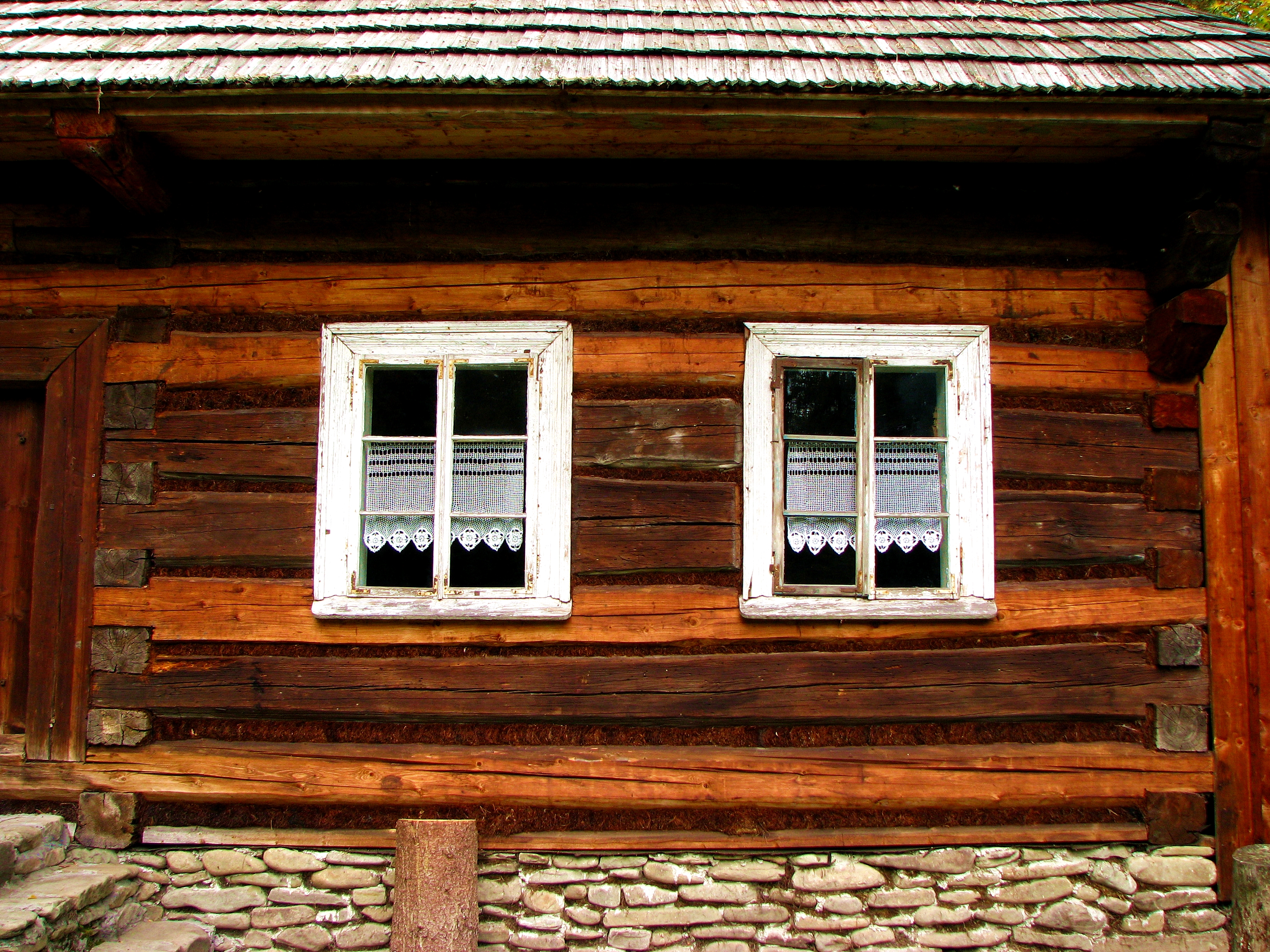 Chałupa wójta Maja (Kostkowiaka), z Sidziny, z II połowy XVIII wieku. Na zdjęciu widoczne okna, elementy konstrukcji zrębowej oraz podmurówka z kamieni.