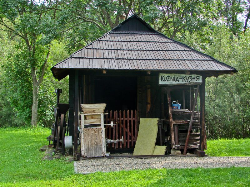 Muzeum Kultury Łemkowskiej w Zyndranowej. Kuźnia przeniesiona z górnej Zyndranowej. We wnętrzu kowadło i miech oraz sprzęt kowalski.