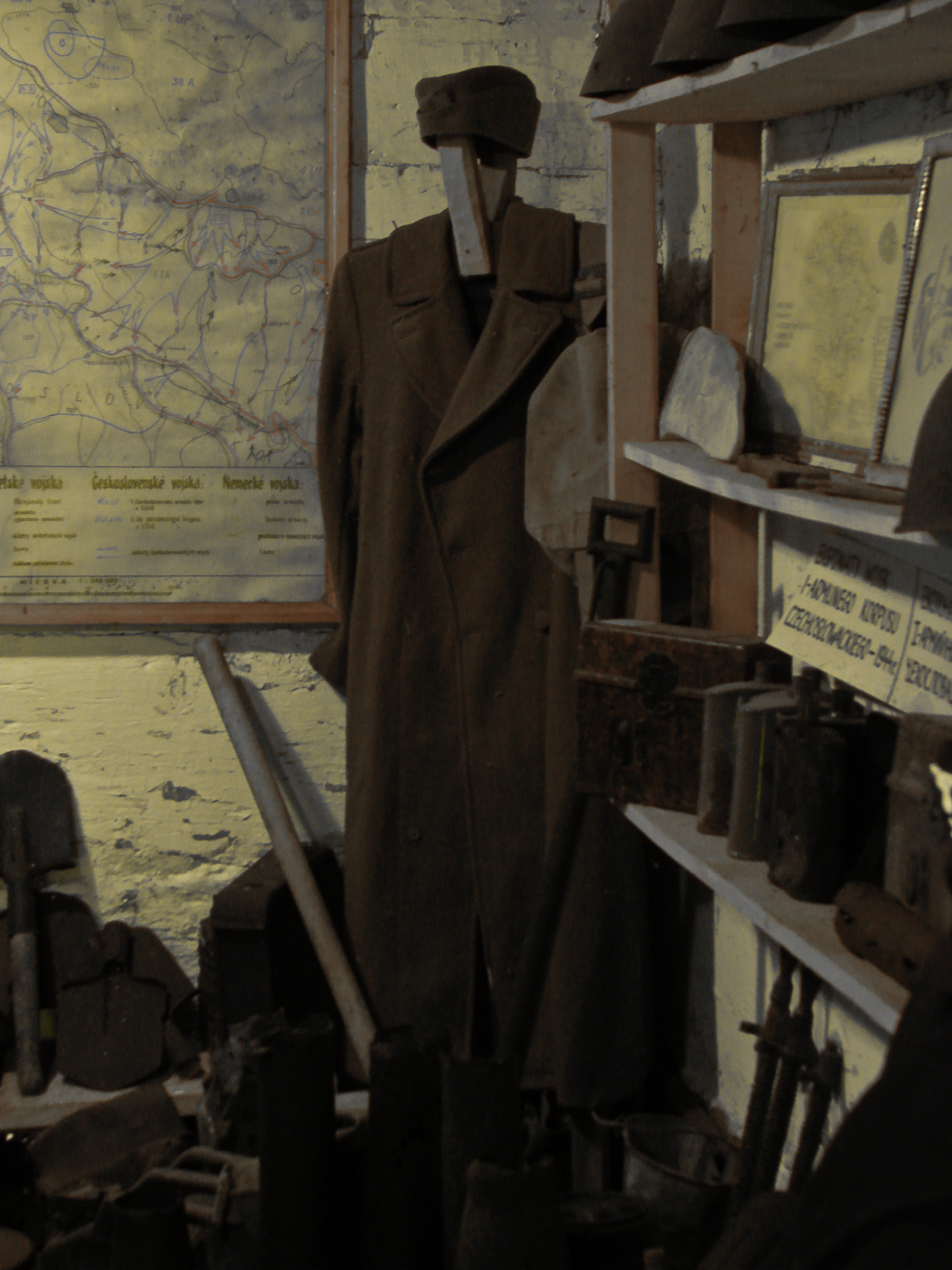 Muzeum Kultury Łemkowskiej w Zyndranowej. Wystawa militariów z I i II wojny światowej znajdująca się we wnętrzu koniuszni.