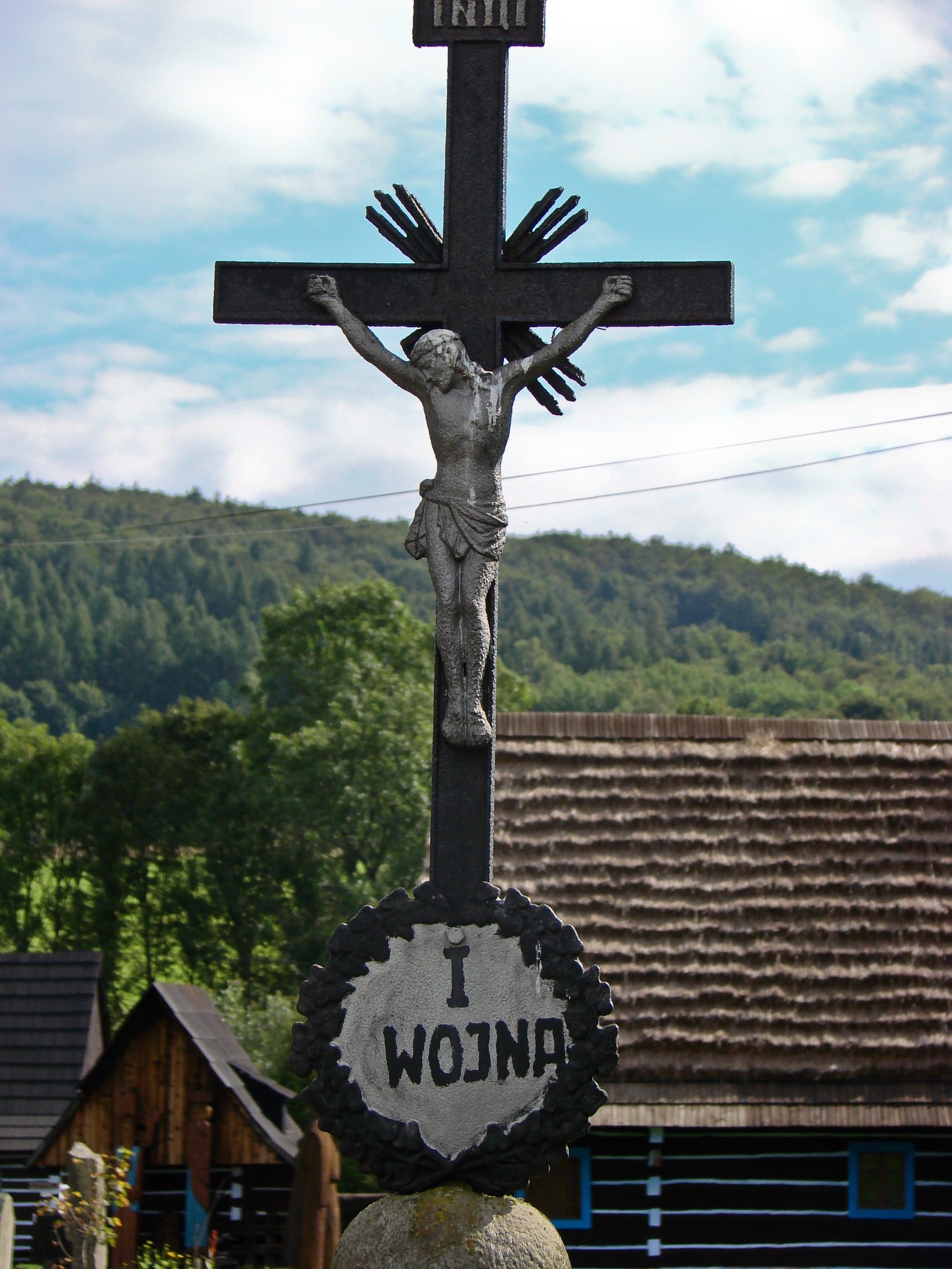 Muzeum Kultury Łemkowskiej w Zyndranowej. Krzyż ku czci ofiar I wojny światowej na tle zabudowań muzeum.