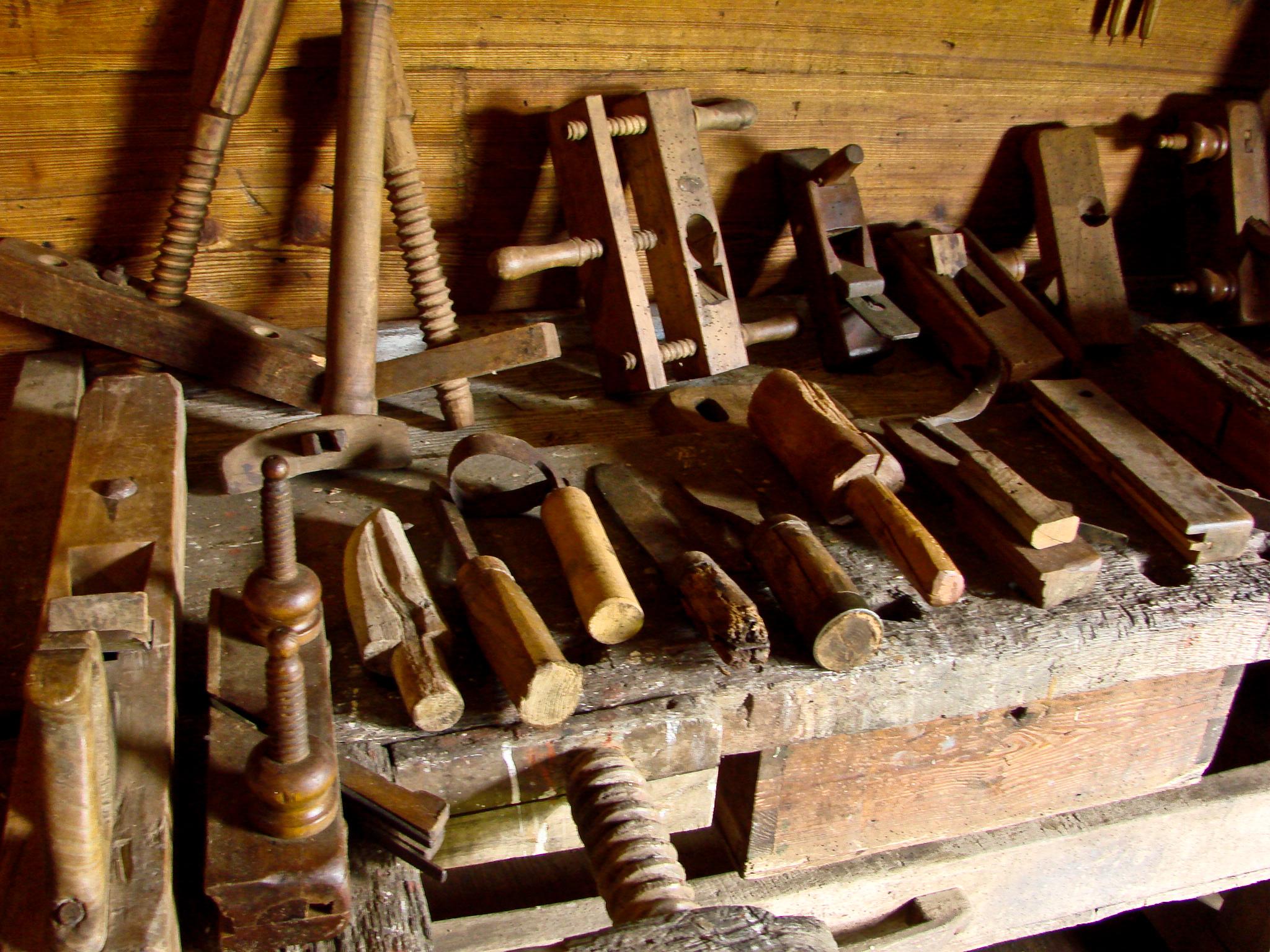 Muzeum Kultury Łemkowskiej w Zyndranowej. Wnętrze chyży - eksponowane w sieni narzędzia stolarskie.