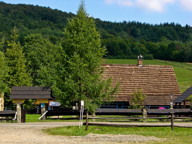 Muzeum Kultury Łemkowskiej w Zyndranowej. Widok na bramę do muzeum.