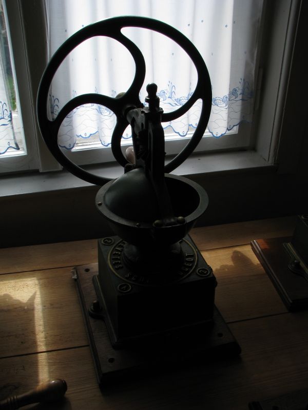 Korbowy, żelazny młynek do kawy "Peugeot Freres Brevetes S.C.D.C" - fragment ekspozycji muzeum.