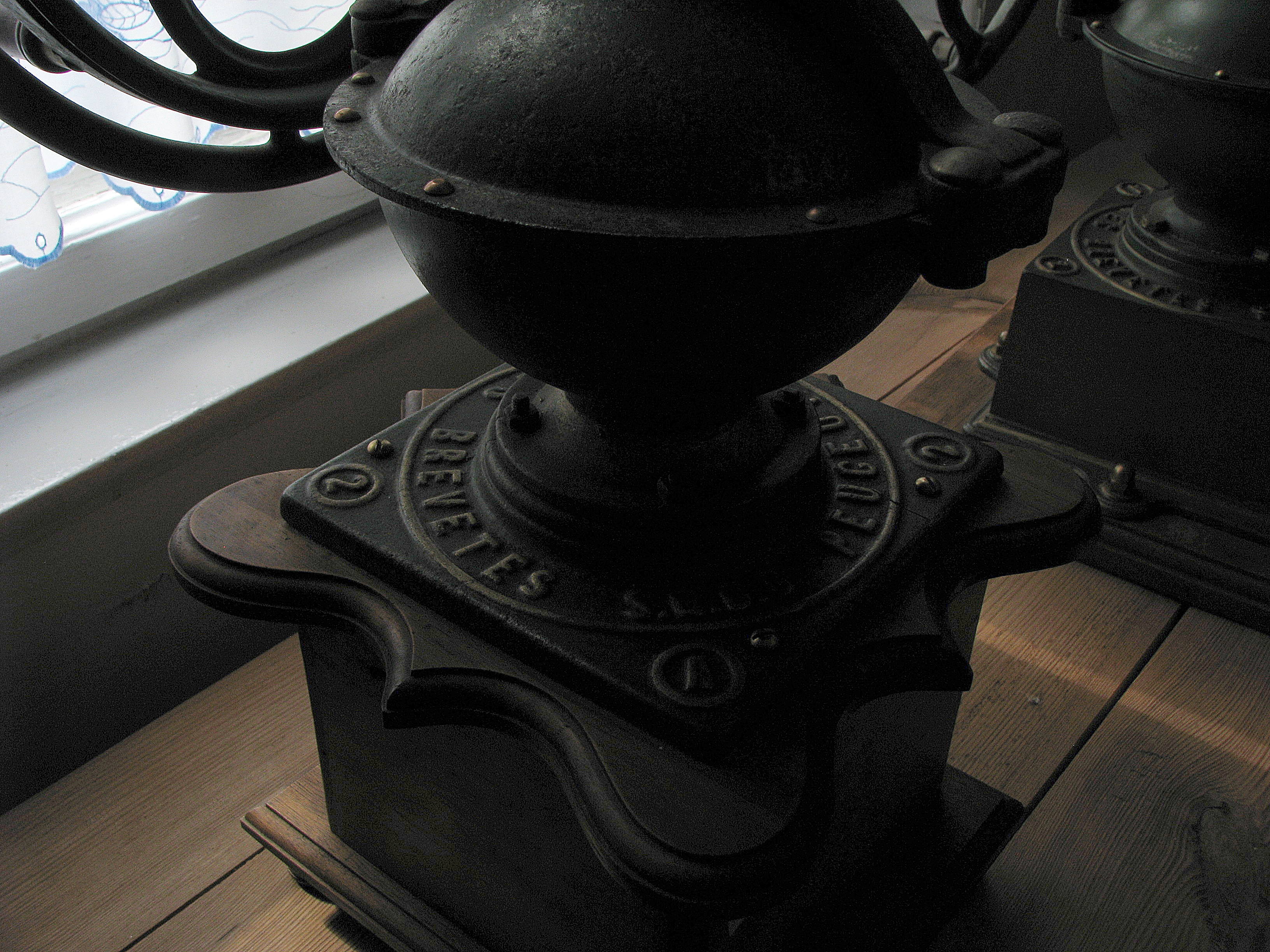 Korbowy, żelazny młynek do kawy "Peugeot Freres Brevetes S.C.D.C" - fragment ekspozycji muzeum.